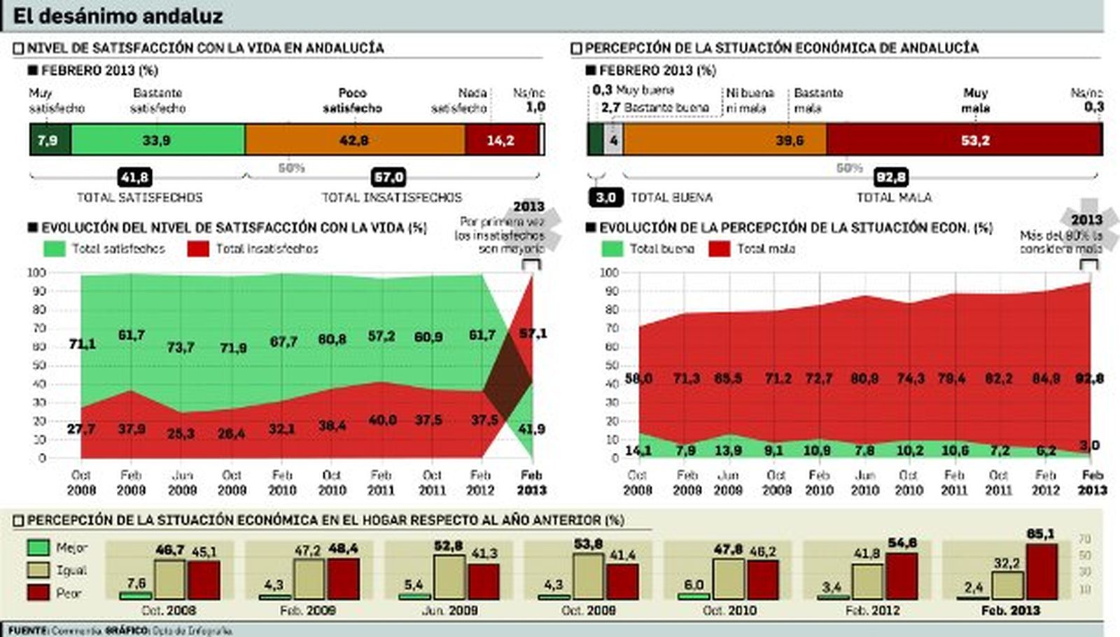 Según los datos del Barómetro Joly de este 28-F, casi seis de cada 10 andaluces consultados aseguran que están poco no nada contentos con su vida. Esta pregunta, que se ha repetido a lo largo de toda la serie de sondeos, no ha llamado la atención hasta ahora porque los descontentos ya suman más de la mitad. La diferencia respecto a hace un año es abismal: entonces, un 37% ya se sentía sacudido por los efectos de la recesión, y ahora suben 20 puntos. Son el 57,1%. El cambio adquiere mayor gravedad si se compara con lo que pasaba en el año 2008, cuando el 71% de los sondeados se encontraban satisfechos, aunque eran conscientes de la crisis económica.