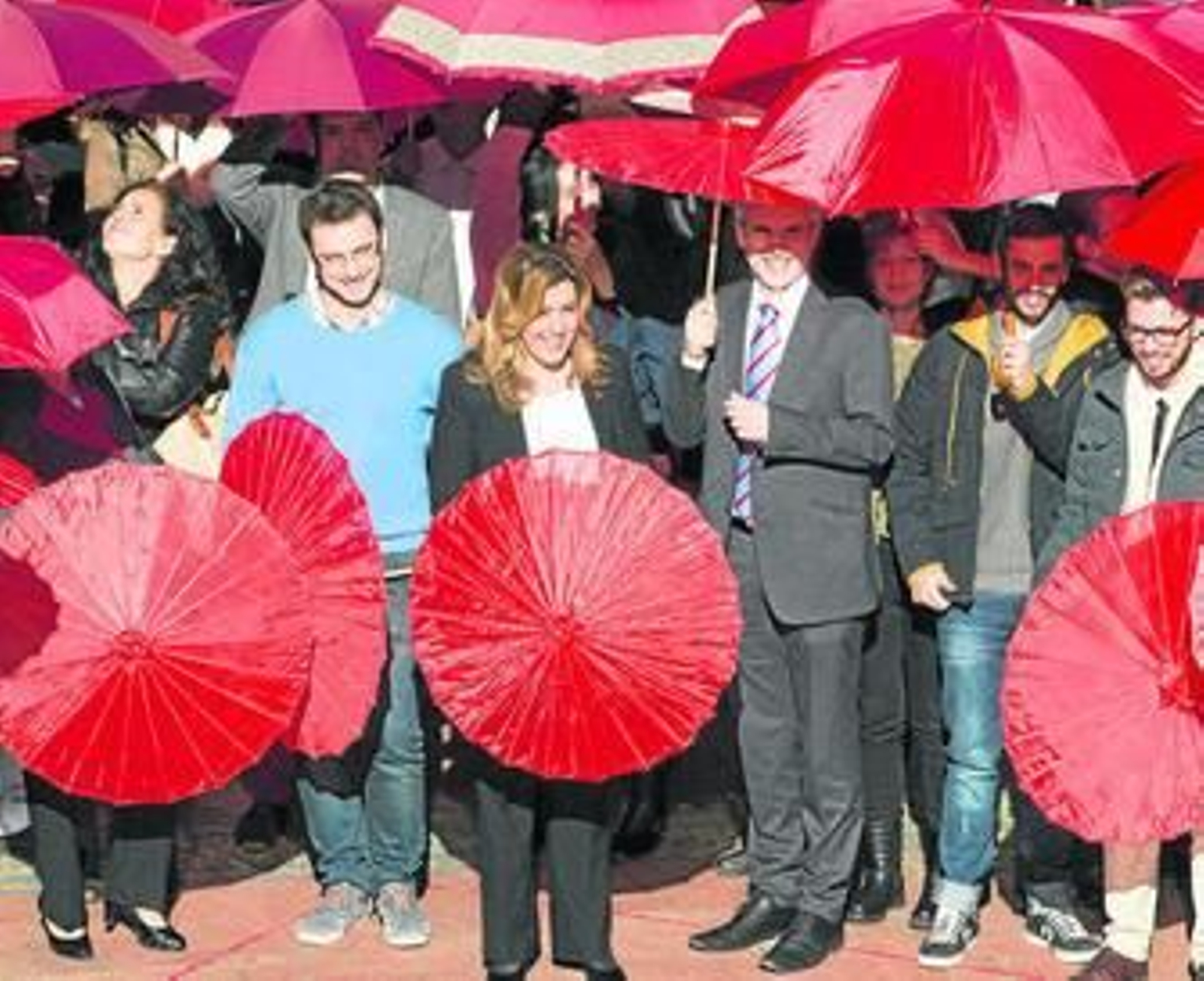 Díaz y estudiantes forman ayer un lazo rojo con paraguas en la celebración del día mundial de la lucha contra el sida.