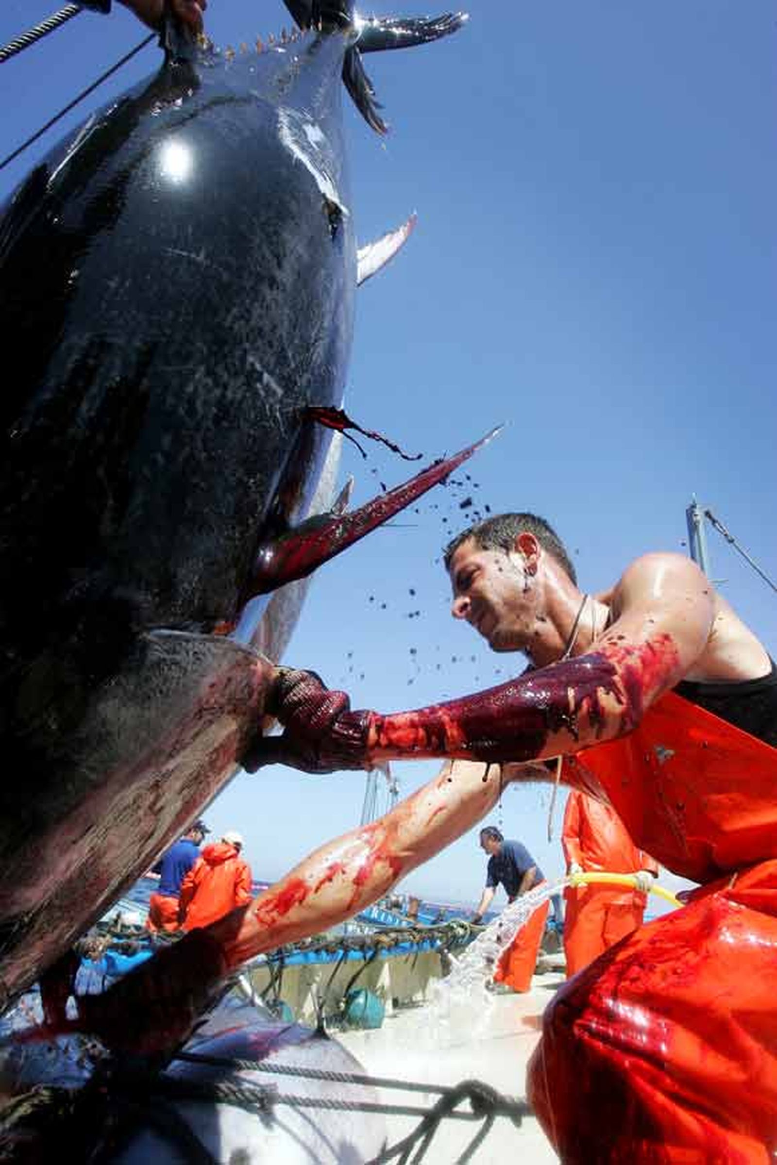 El precio medio del atún gaditano en primera venta es 11 euros el kilo. Después de media hora de éxtasis pesquero, la almadraba de Zahara tiene 204 grandes atunes que pesar. Todas las barcazas regresan a puerto salvo una, que transporta la mitad de la captura directamente a un buque japonés fondeado a apenas un par de kilómetros de la pelea. El país asiático, que exporta la pasión por el pescado crudo, se come la mayor parte del mercado mundial del atún. En Tsukiji, la carne roja de almadraba andaluza es un manjar muy cotizado. Es la lonja de Tokio, la mayor del mundo. Una de sus campañas publicitarias recuerda y avisa: “Vivimos en el planeta que tiene mar”.