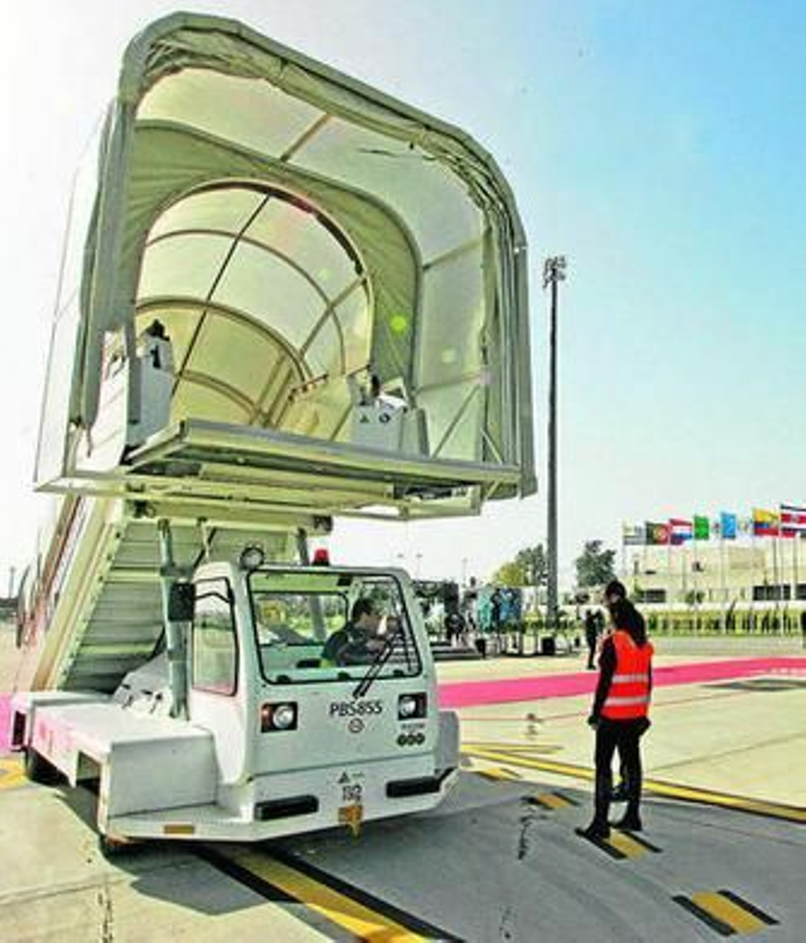 Aeropuertos Españoles y Navegación Aérea (Aena) dispuso una grada para prensa así como una alfombra roja de 25 metros de longitud para recibir a las misiones extranjeras. Todo se medía ayer al milímetro, tanto es así que hasta se ensayó el punto exacto en el que los aviones deberían parar para que la escalerilla cubierta deje a los ilustres pasajeros a pie de alfombra.