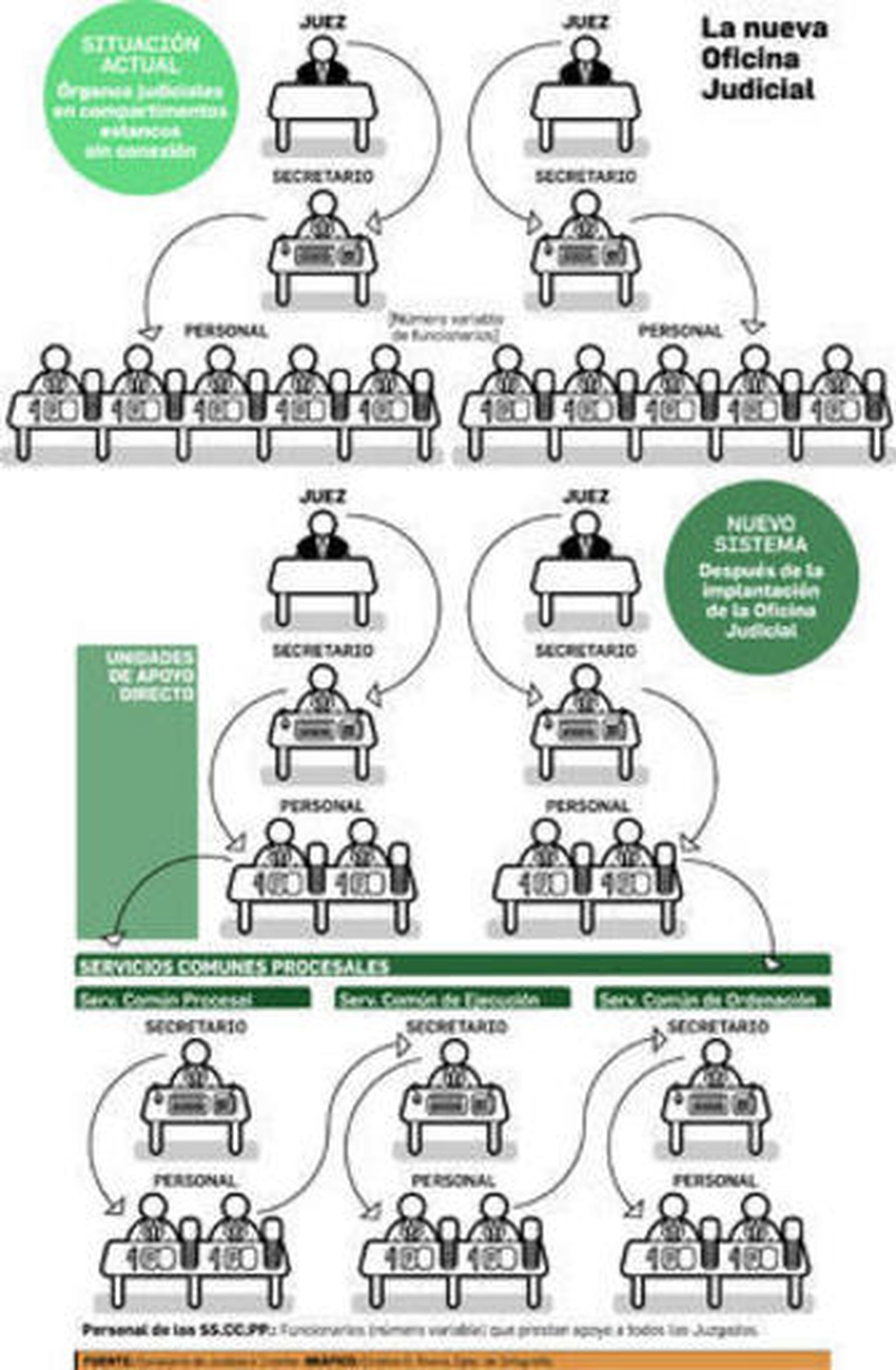 El proyecto que impulsa el consejero de Justicia e Interior, Emilio de Llera, pretende dar respuesta a una reforma que la Justicia espera desde hace una década, en concreto, desde la ley orgánica 19/2003 que modificó la ley orgánica del Poder Judicial e introdujo la organización de la Oficina Judicial. Por el momento, no se ha establecido el número de funcionarios que se quedarán en las unidades de apoyo directo a cada juez, ni cuantos integrarán los servicios comunes, lo que se determinará cuando se establezcan las correspondientes Relaciones de Puestos de Trabajo (RPT).