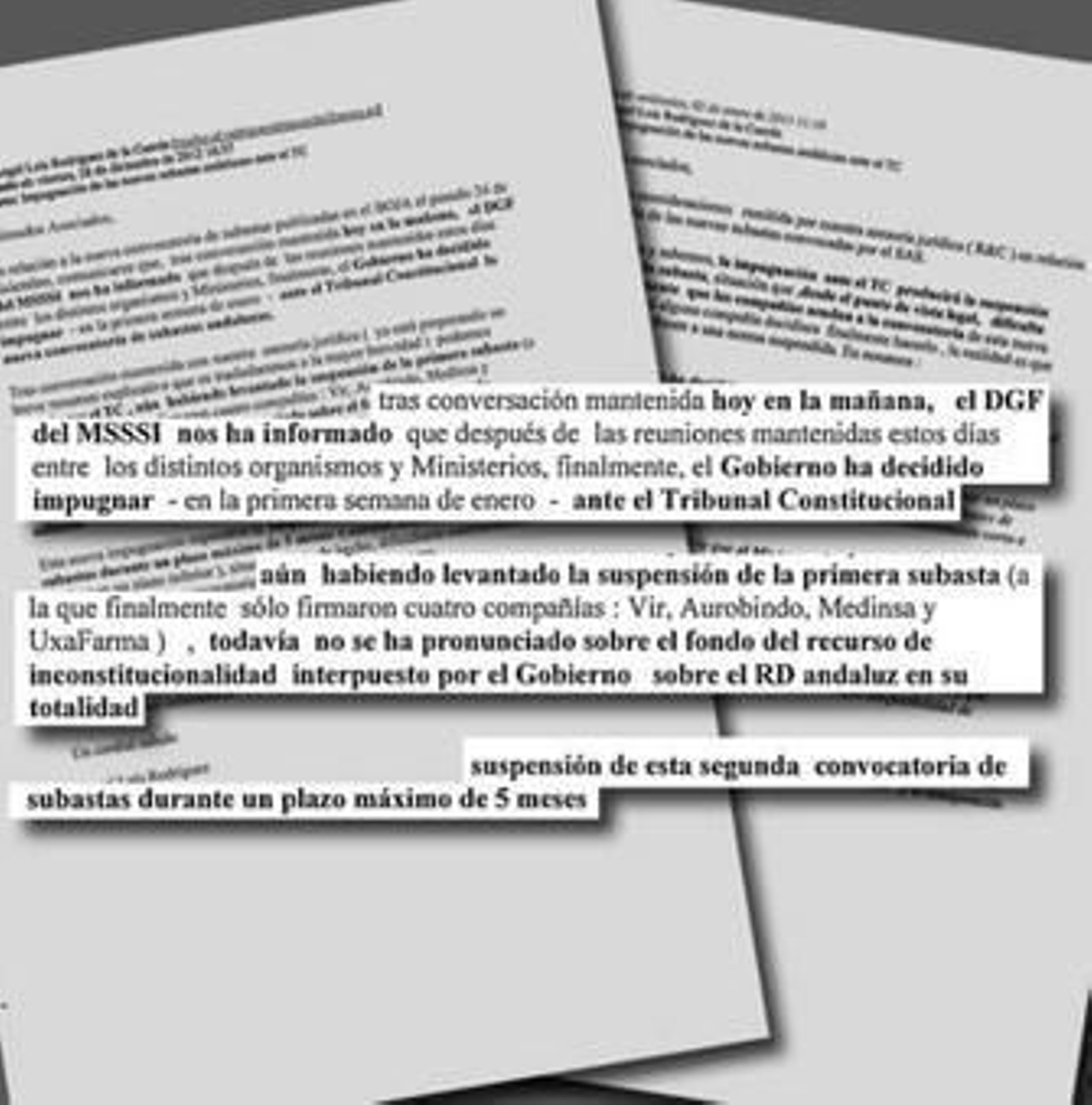 Dos correos electrónicos conocidos ayer indican que, aunque el Gobierno no esté muy seguro del resultado final, lo que busca es tiempo para que la subasta de la Junta no se produzca. De hecho, el plazo de presentación de propuestas por parte de los laboratorios termina el 18 de enero, que es cuando el Consejo de Ministros puede aprobar la presentación del recurso. En un correo enviado por el director de la patronal de los laboratorios de genéricos (Aeseg), Ángel Luis Rodríguez de la Cuerda, a sus asociados les indicó el pasado 28 de diciembre que la Dirección General de Farmacia le comunicó hacía cuatro días que el Gobierno había tomado esa decisión, por lo que la impugnación produciría una suspensión de cinco meses. La patronal, en otro correo enviado el 2 de enero, juzga que esos cinco meses " es un espacio relativamente corto", por lo que "resulte necesario que el Ministerio impugne también en vía contencioso-administrativo". "De esta forma -sigue Rodríguez de la Cuerda- , una vez que el Constitucional alce la suspensión, se podría intentar una solicitud idéntica ante el contencioso". Y añade entre paréntesis: "Extremadamente difícil, pero no imposible". Parece, pues, a la vista de tales correos, que el Gobierno y la patronal buscan, con este segundo recurso, una maniobra dilatoria para impedir la subasta.