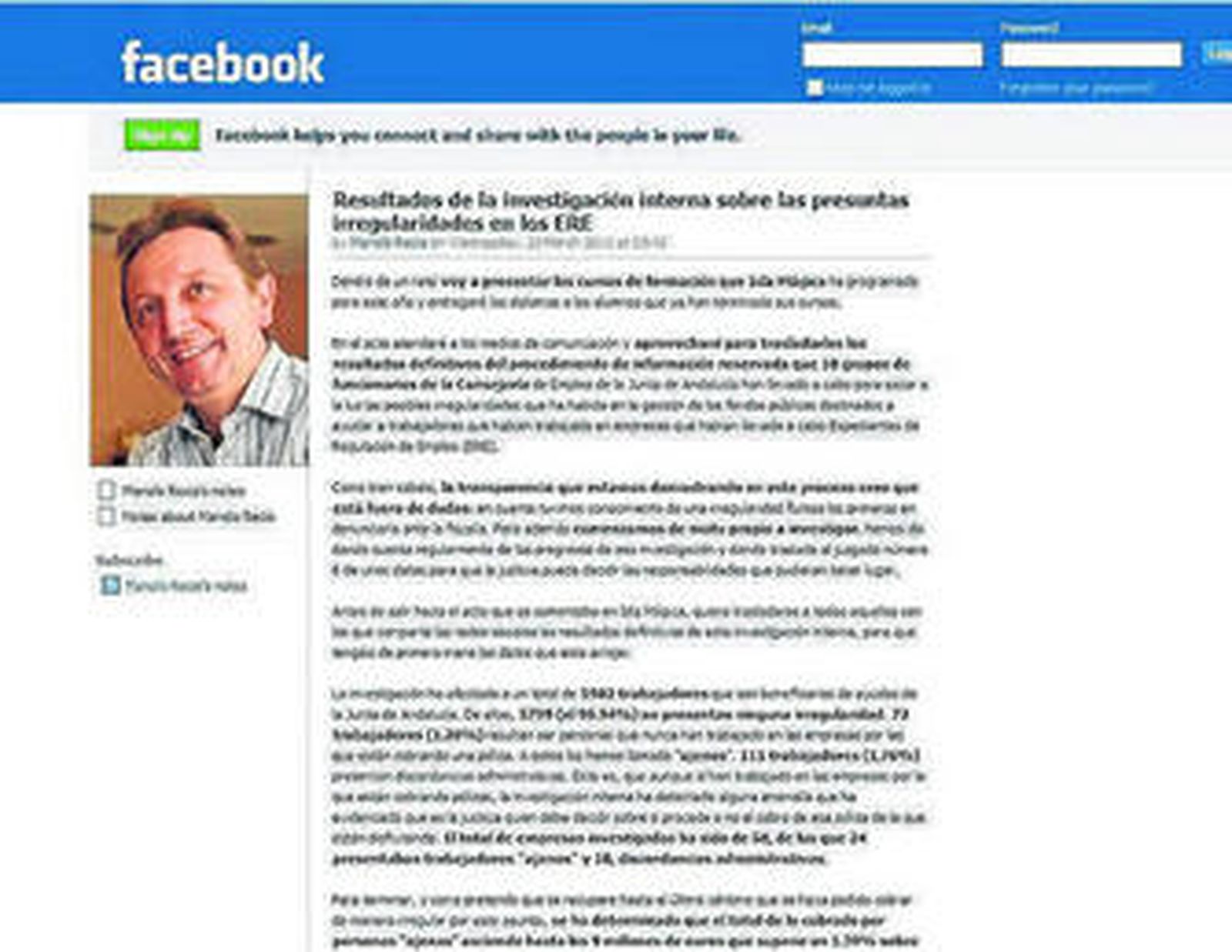 Ejercicio de transparencia o falta de respeto a las instituciones. El PSOE y el PP no consiguen ponerse de acuerdo ni en el uso adecuado de las redes sociales. Dos visiones diametralmente opuestas sobre un mismo hecho: la publicación en Facebook por parte del consejero de Empleo, Manuel Recio, de los últimos datos de la investigación de la Junta sobre los expedientes de regulación de empleo irregulares, antes incluso de darlos a conocer a la oposición y a los medios de comunicación. Recio, apasionado y gran defensor de la utilización de la red como altavoz de la gestión política, no tuvo dudas a la hora de avisar en Twitter: "He colgado en mi FB una nota en la que doy a conocer los resultados del proceso interno de investigación sobre los ERE". Y ciertamente, en su página de Facebook había dejado a las 11:42 un texto en el que enumeraba las cifras definitivas de las citadas pesquisas, junto a la promesa de recuperar "hasta el último céntimo". Cuarenta y cinco minutos más tarde, el consejero atendió a la prensa e hizo oficialmente públicos los datos. El PP montó en cólera.