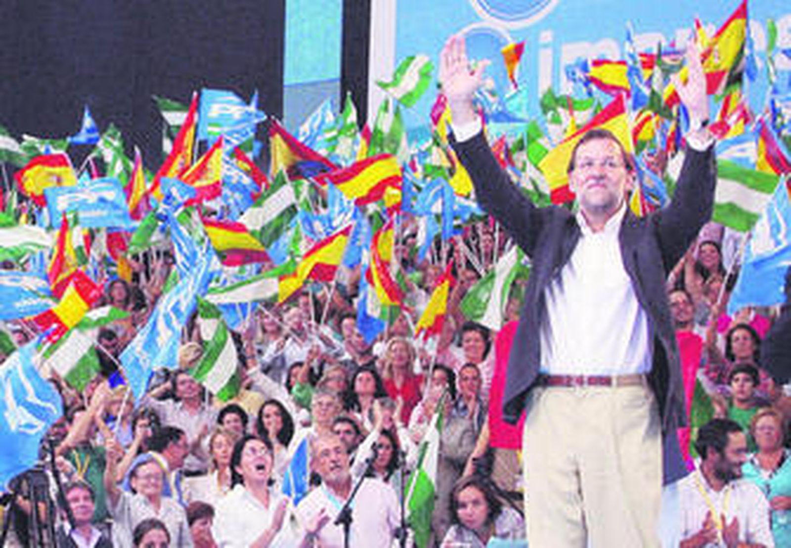 El gran artífice de que las marcas del paro "hayan batido todos los registros" y de que España vaya a ser el único país de la zona euro que no vaya a salir de la recesión a finales de año fue tildado de "incompetente" y "mentiroso" sin descanso por el líder del PP, que criticó también la "soberbia, el sectarismo y las improvisaciones" del presidente del Gobierno. Ante esa "quintaesencia de la mentira" que "empobrece y liquida al país", ante ese "maniqueísmo de buenos y malos, ricos y pobres, sindicatos y empresarios, en el que no hay sitio para los autónomos y las clases medias", Rajoy se erigió como alternativa y prometió que los populares "darán la batalla" para sacar del hoyo a este país. "El PP va a solucionar esta crisis, hemos demostrado que sabemos hacer las cosas". Con ese tono patriótico al que dio alas la escenografía del velódromo, con una profusión de enseñas nacionales nunca vista por esos lares, el líder del PP insistió en que "los españoles tienen derecho a la esperanza, las cosas pueden ser de otra manera y los españoles deben verlo, esto no es irremediable, aquí está la alternativa, los que representamos a la España real".
