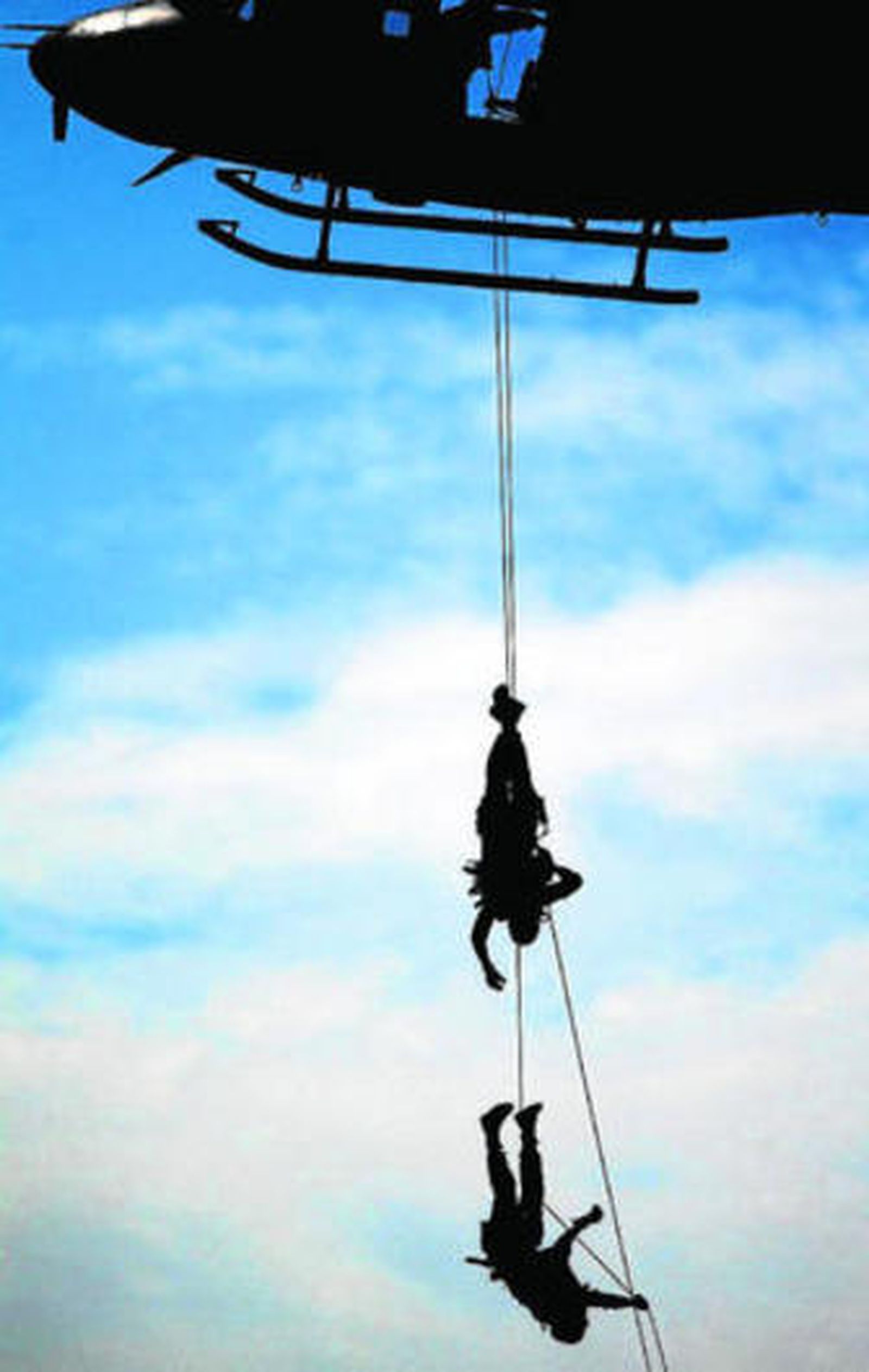 El sol aprieta y el viento molesta, pero el público resiste. Cientos de policías, sanitarios y miembros de Protección Civil velan para que la gente disfrute de una exhibición que intenta acerca el mundo militar a la sociedad civil. Mientras la realidad discurre sin sobresaltos, en la ficción el ataque contra los rebeldes parapetados en la playa se sigue fraguando. Otros dos helicópteros se quedan por unos instantes suspendidos a bastante altura sobre la playa. De repente, varios militares de la Armada se descuengan haciendo rápel. Pero, lo hacen bocabajo. Toda una demostración de destreza que deja boquiabierto al público.