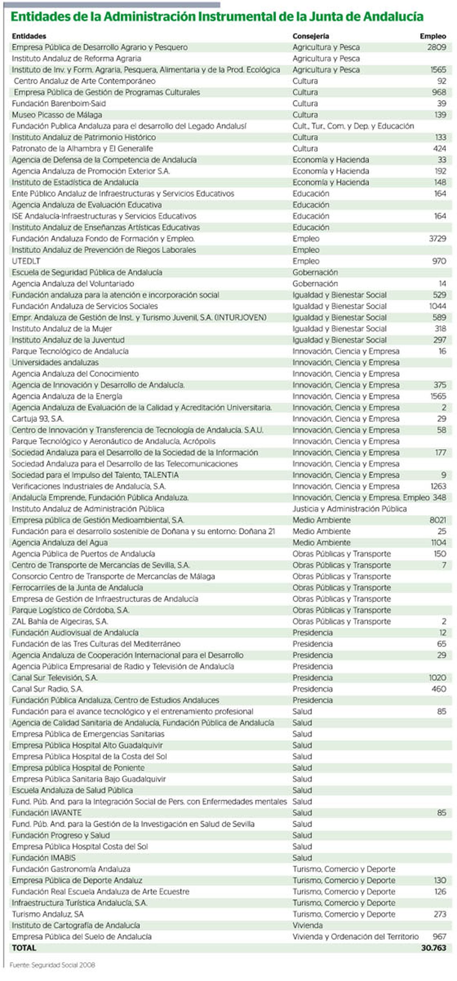 Si tomamos como referencia el último de los datos mencionados y se suma el número de empleos recopilados en el trabajo de campo, en relación con las entidades de carácter instrumental, y cuantificado en torno a los 30.000 empleos, podemos afirmar que la denominada administración instrumental representa aproximadamente el 11,6 por ciento del total de los empleos de la Junta de Andalucía.