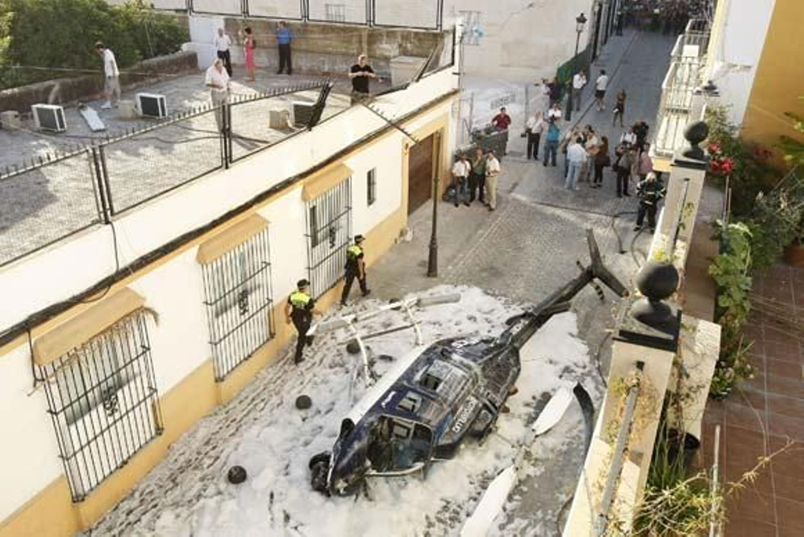 Eran las cinco menos diez de la tarde de un domingo hasta entonces de lo más normal cuando un helicóptero con tres personas a bordo se estrellaba contra el pavimento de la céntrica calle San Juan, en El Puerto, junto a la Iglesia Mayor Prioral y en pleno casco histórico de la ciudad.