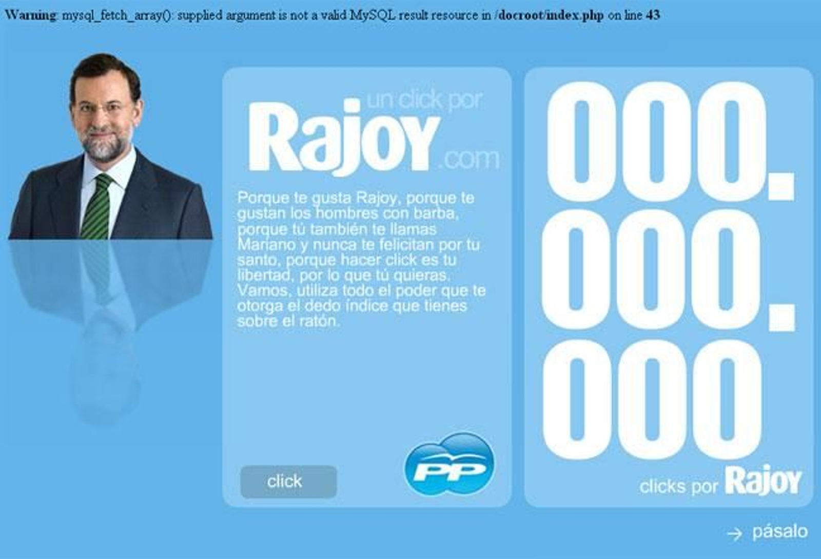 No obstante, los directores de campaña sureños no han de sentirse acomplejados, estas cosas pasan hasta en las mejores familias: UnclickporRajoy.com, la nueva iniciativa cibernética de Mariano, no funciona. La idea es contabilizar una cantidad ingente de clicks de ratón como si fueran vivas por el candidato (aunque sea "porque te gustan los hombres con barba"), pero, al menos en el momento de escribir este artículo, un error de la base de datos hace que hasta ahora nadie haya movido un dedo por Rajoy.