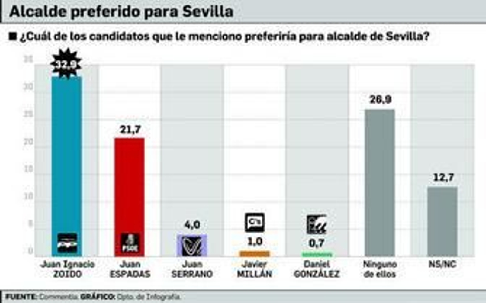 Un 26,9% de los encuestados rechaza a todos los candidatos, pero Zoido sigue siendo el preferido. Millán es el mejor visto de los alcaldables de los pequeños partidos.