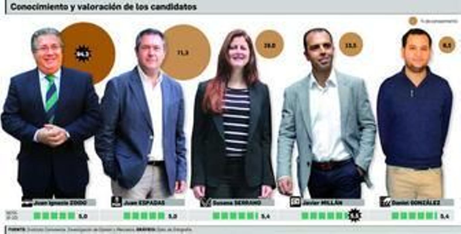 EL refrán de más vale malo conocido que bueno por conocer no sirve en materia electoral. La puntuación que reciben en la encuesta los candidatos a la Alcaldía es más alta cuando se trata de un nuevo alcaldable que cuando éstos tienen ya una trayectoria, como es el caso del alcalde, Juan Ignacio Zoido, y el actual líder de la oposición, Juan Espadas. Ninguno de los dos supera el 5. Aprobado raso. Algunas décimas más consiguen los otros tres por los que se ha preguntado en la consulta. El que obtiene una mayor nota es Javier Millán, de Ciudadanos, con un 5,5. Una décima menos reciben Daniel González Rojas, de Izquierda Unida, y Susana Serrano, de Participa Sevilla.