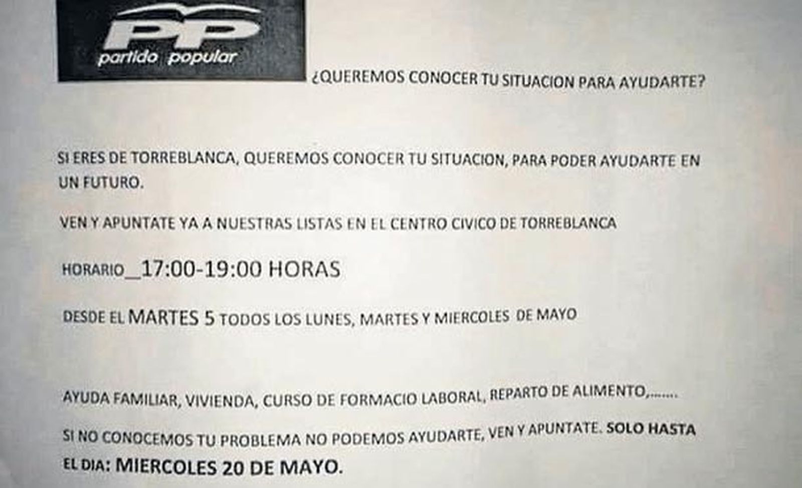 Tal y como adelantó la semana pasada este periódico, desde unos días antes del inicio oficial de la campaña electoral se habían buzoneado y repartido octavillas de forma masiva por el barrio con el logotipo del PP donde se invitaba a los vecinos a acudir al centro cívico para dar cuenta de sus necesidades y ser incluidos en una lista para poder acceder en un futuro, por ejemplo y según se cita en la propia propaganda, a repartos de alimentos, ayuda familiar, de vivienda o cursos de fomación laboral.