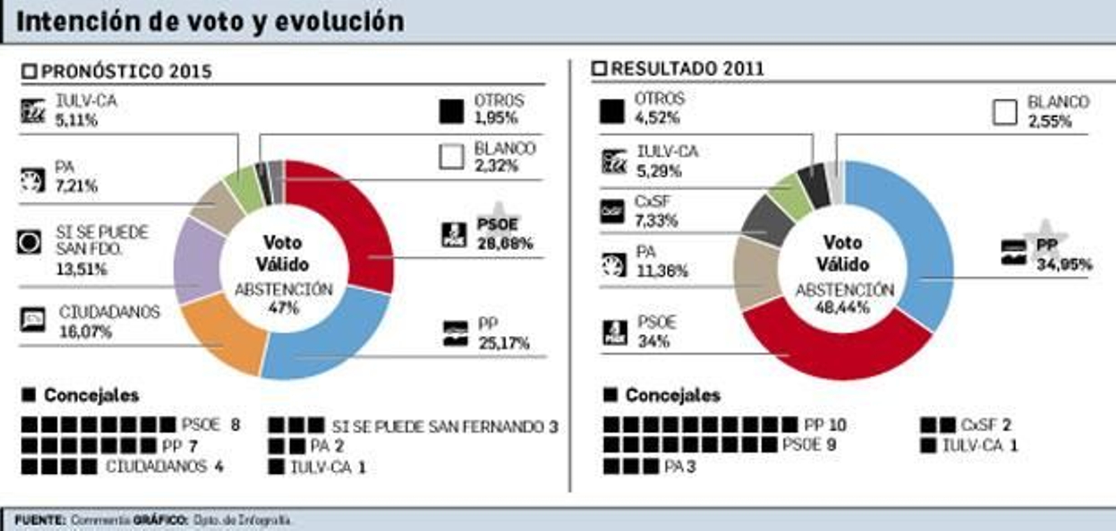Un análisis somero de la estimación de voto realizada por Commentia revela en primer lugar una caída reseñable de las previsiones para los dos grandes partidos, más acentuada en el caso del PP. Los populares, que han tenido tradicionalmente en La Isla una importante presencia electoral, fueron la formación más votada en los comicios de hace cuatro años, en los que se vio beneficiada por el enorme desprestigio nacional de los socialistas y la consiguiente ola favorable al partido de Mariano Rajoy. Entonces, alcanzaron el que es hasta ahora su techo en San Fernando, un 34,95% de votos y una mayoría simple de 10 escaños, dos más que en las anteriores citas de 2007 y 2003. Este resultado les llevó por primera vez a la alcaldía, en su tradicional coalición con el PA, aunque en numerosas ocasiones anteriores lo había hecho como socio minoritario de los andalucistas.