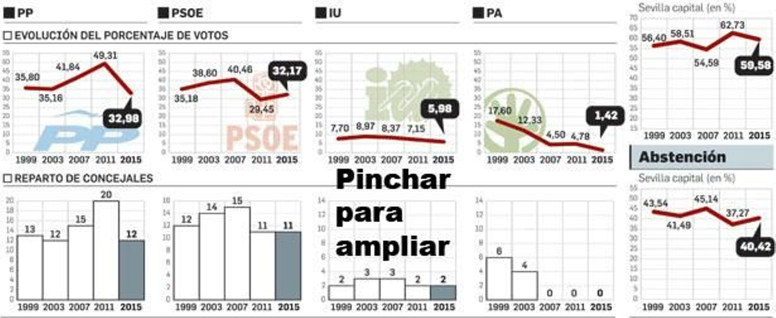Izquierda Unida, en contra de los vaticinios de las encuestas, logró mantener sus dos concejales con una candidatura encabezada por un joven de 26 años y absolutamente desconocido, Daniel Gonzalez Rojas, y un equipo renovado. Porcentualmente, la atomización de la izquierda sólo restó un punto a la federación, que resistió frente al avance de Participa Sevilla, el partido instrumental apoyado por Podemos, que sentará en el Pleno municipal a tres concejales. Precisamente uno de los incidentes de la jornada de ayer tuvo que ver con enfrentamiento protagonizado por ambas fuerzas en colegios electorales del centro, a cuento del supuesto acoso de los interventores de IU y otros partidos a los de Participa Sevilla. Equo, la formación donde se aglutinó la plataforma Ganemos, no llegó al 1,4% de representación, quedando incluso por debajo del Partido Andalucista que, una convocatoria más, vio frustrado su sueño de regresar al Ayuntamiento de Sevilla, donde perdió sus sillones en 2007. El esfuerzo de la candidata Pilar Távora, tan loable, no evitó que la histórica formación se quedara con apenas 4.300 votos (1,4%), sólo unos cuantos más que Equo o el Partido Animalista. UPyD confirmó su fracaso con sólo 2.500 votos, que no le dieron ni para un 1%.