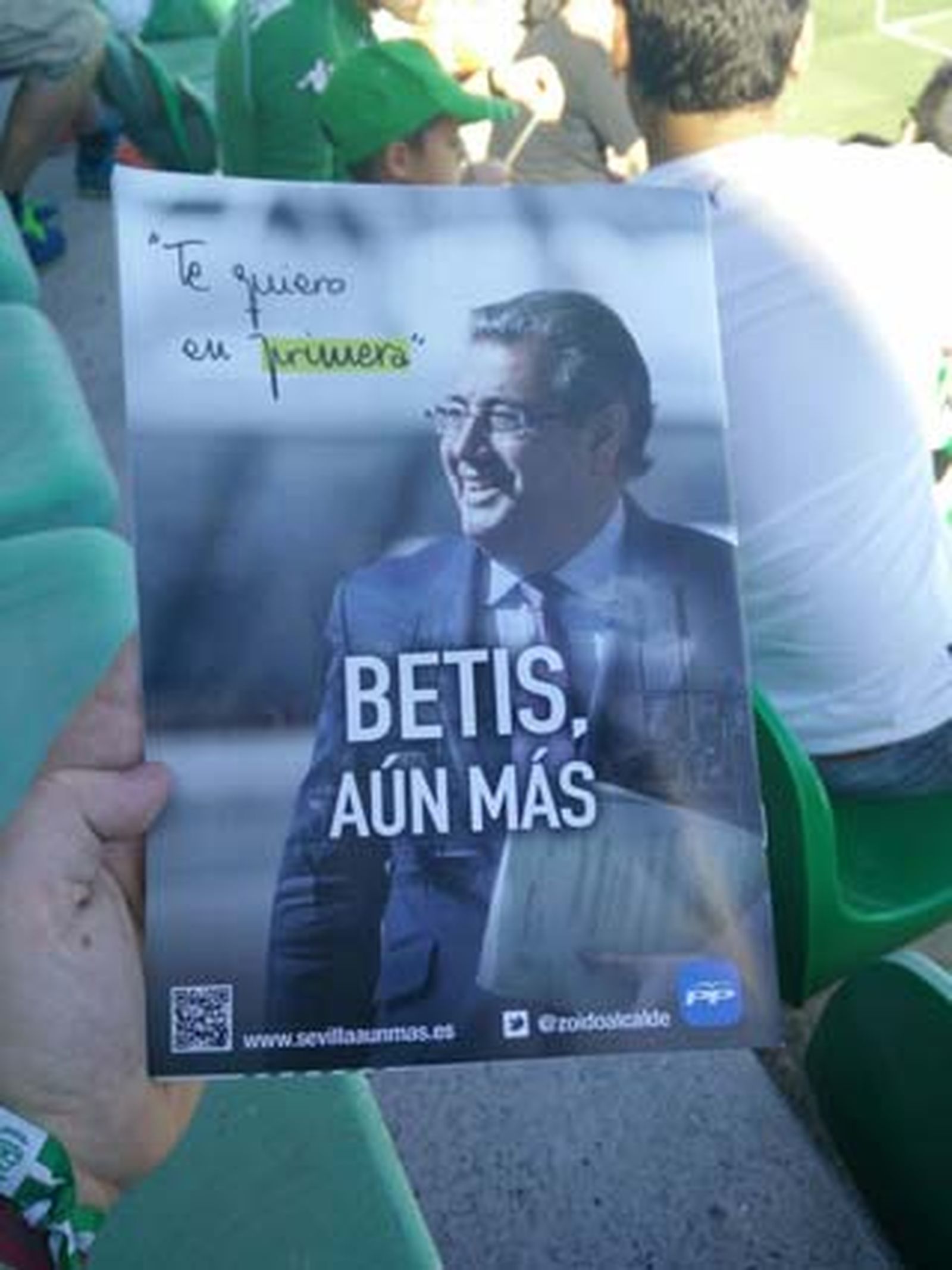 Los aficionados que acudieron el pasado domingo al estadio Benito Villamarín recibieron una propaganda electoral del PP con la que el alcalde quiso hacer un guiño al equipo local, que esta semana podría tener opciones de ascender a Primera División. "Te quiero en primera. Betis, aún más", rezan los carteles jugando con el eslogan de la campaña de Zoido, "Sevilla, aún más". Vincular la imagen de Zoido a un club que mueve al menos a la mitad de la población de la capital es un acierto. Éxito total. Lo que no estuvo previsto fue un reparto similar en el Sánchez Pizjuán y ya parece imposible, pues el próximo partido será el sábado, jornada de reflexión, en... Málaga. "Te quiero en la Champions. Sevilla, aún más", podría haber sido es eslogan para el club de Nervión. Zoido, sevillista confeso, quizás pensó que los béticos están más necesitados de atenciones en estos momentos. ¿Se hizo de repente bético? Los sevillanos le conocen de sobra y saben de sus colores, apuntan en su equipo de campaña.