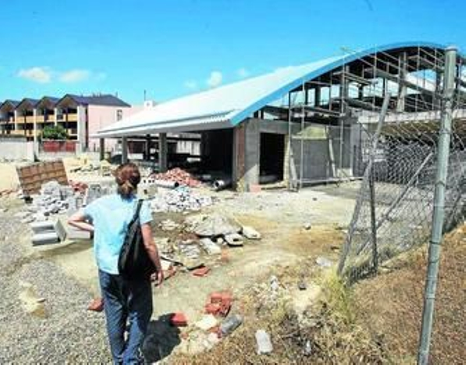 La trasera de la piscina a medio hacer y los balcones, llenos de palomas, del hotel La Alquería.