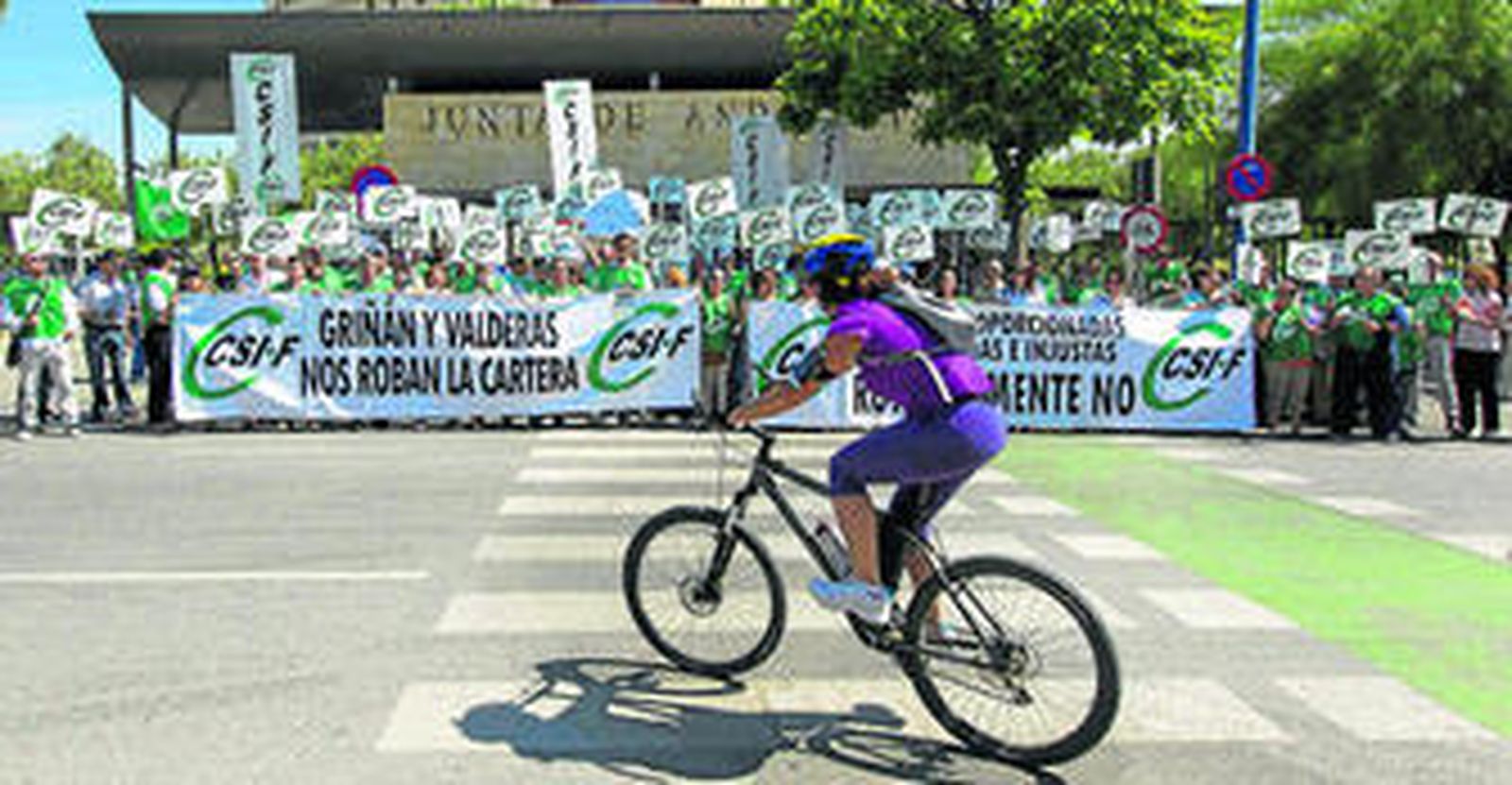 Los sindicatos corporativos CSIF y Safja convocaron ayer actos de protesta en sedes de la Junta de Andalucía contra el plan de ajuste aprobado por la Administración autonómica que recorta 777 millones en lo sueldos de los empleados públicos. La central CSIF de Andalucía convocó concentraciones en todas las capitales de provincia y cifró la convocatoria en 3.500 delegados sindicales en toda Andalucía. Una de las protestas más numerosas se llevó a cabo en el edificio Torretriana, sede de la Consejería de Hacienda y Administración Pública.