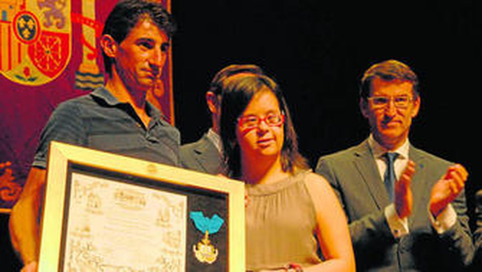 La joven de San Fernando (Cádiz) Fátima Reyes Quijano -una de las supervivientes del trágico accidente ferroviario de Santiago- fue la encargada de entregar ayer a los vecinos de la parroquia de Angrois la medalla de la ciudad en el Real Teatro de Las Cortes. Testigos del emotivo acto fueron el presidente de la Xunta de Galicia, Alberto Núñez Feijóo, y el alcalde de la capital gallega, Ángel Currás. La distinción la recogió Francisco Otero, el hombre que rescató a Fátima Reyes de los vagones destrozados del Alvia descarrilado el 24 de julio.