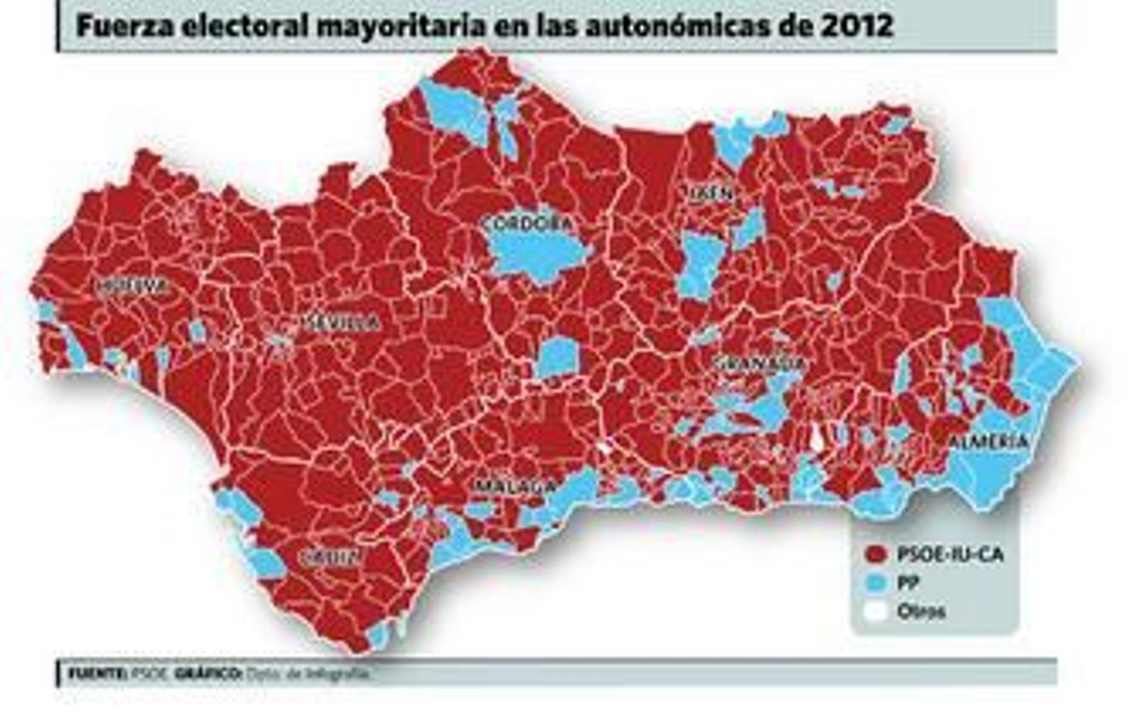 La legitimidad de un acuerdo de gobierno del PSOE-A e IU-CA es total: la suma de votos de ambos gana en 640 municipios, en el 83% de los pueblos y ciudades de Andalucía. Gana en las ocho provincias: desde el 58% de los municipios de Almería o el 80% de Cádiz, Granada y Málaga a más del 90% de las otras cuatro.