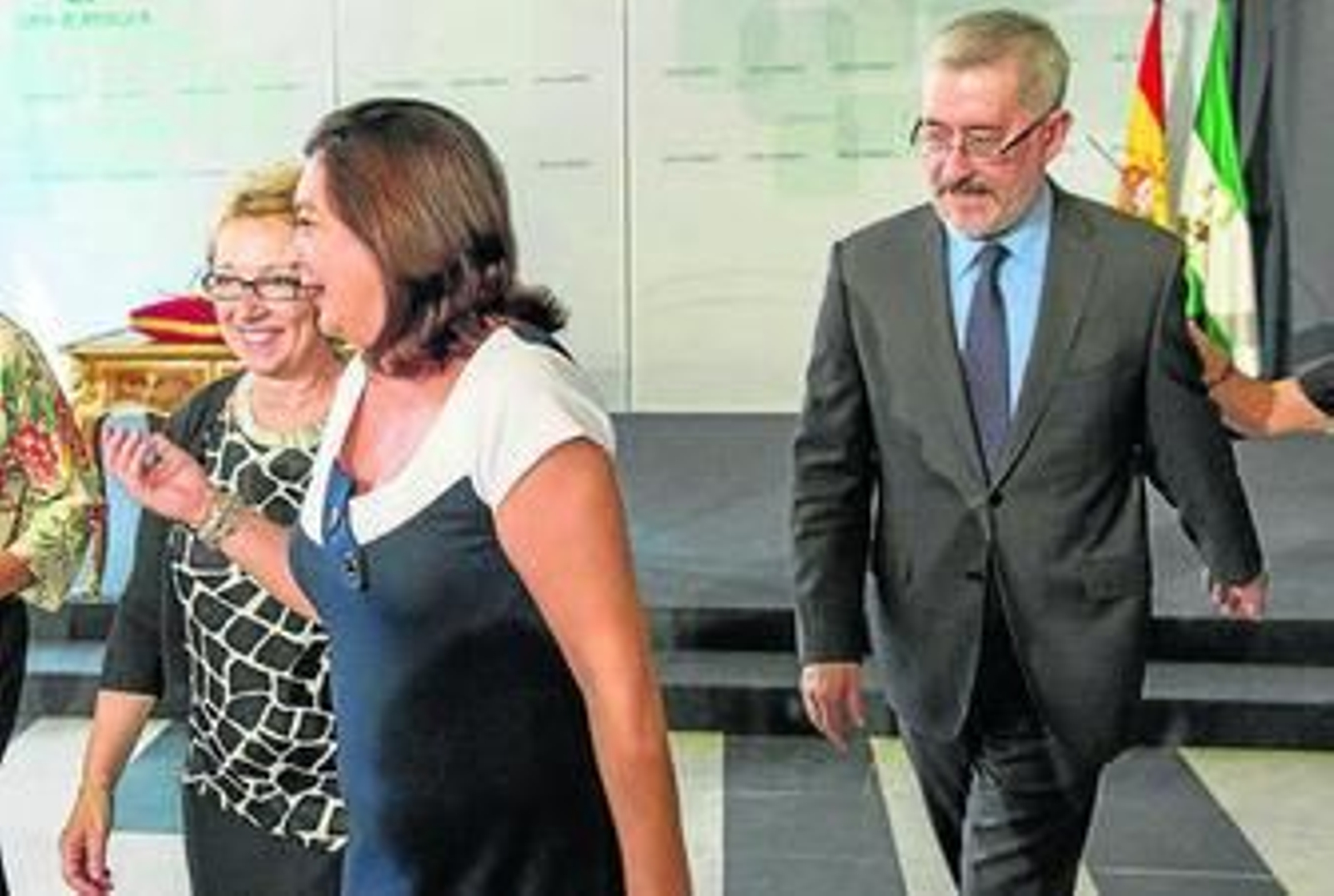 Aguayo y Ávila habían entrado juntos en la sala por orden protocolario junto a la ex consejera de Educación, Mar Moreno, a quien IU echará de menos. En el salón de los Espejos esperaban desde hacía rato otras autoridades (la Mesa del Parlamento) y los tres entraron compungidos, en especial, Moreno. El acto comenzaba con 20 minutos de retraso por la llegada tardía de la presidenta. Tras el paseíllo de los ex consejeros, bajaron de los despachos (en bloque, pero por separado) los consejeros del nuevo Gobierno, encabezados por el equipo económico: José Sánchez Maldonado, Pepín para los conocidos, y María Jesús Montero, nueva consejera de Hacienda. Les siguieron los demás casi de corrido, salvo De Llera, tras ellos, Máximo Díaz Cano, y para concluir, el presidente del Parlamento, Manuel Gracia, junto a Susana Díaz.