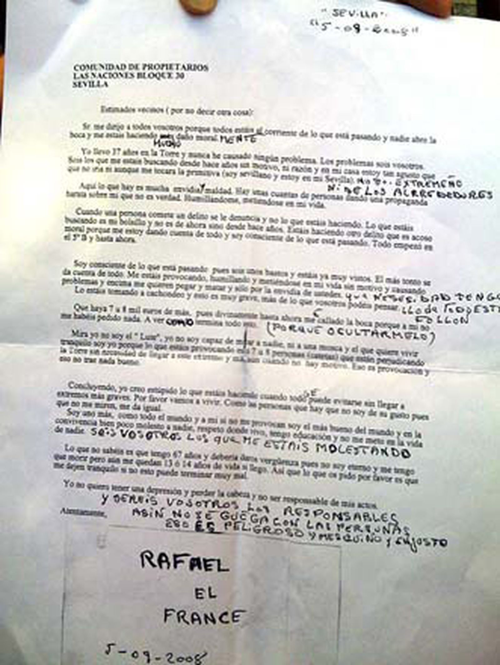 Como Rafael entendía que no se tomaba ninguna medida llegó a amenazar, incluso por carta, a los vecinos y al administrador de la comunidad, según Morales.