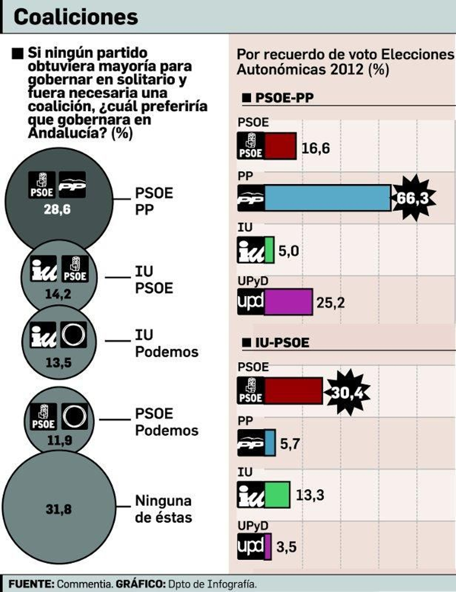 Menos aceptación recibe una posible alianza entre PSOE y Podemos, que se perfila como la tercera fuerza del Parlamento de Andalucía ya que lograría entre 18 y 21 parlamentarios, de acuerdo con el sondeo. Esta opción sólo seduce al 11% de los encuestados. Como dato curioso, la alianza entre IU y Podemos -que sería insuficiente para formar gobierno-, cuenta con la aprobación del 60% de los votantes de IU en 2012. Esta cifra constituye otro indicio del trasvase de sufragios de la coalición de izquierdas a la formación de Pablo Iglesias, que prácticamente va a fagocitar a los izquierdistas en Andalucía.