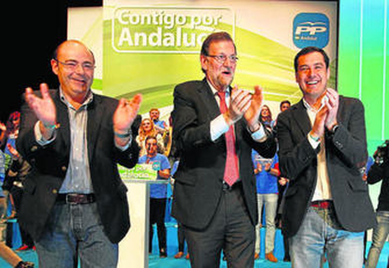 Sebastián Pérez, Mariano Rajoy y Juanma Moreno.