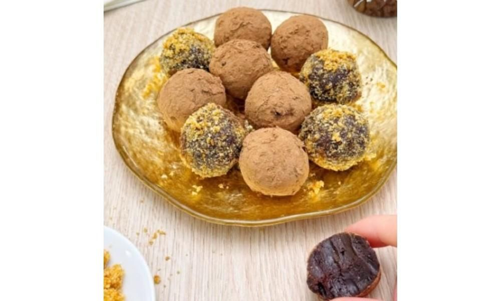 - Con una cucharilla o las manos, forma bolitas de la mezcla y pásalas por cacao en polvo o por praliné.