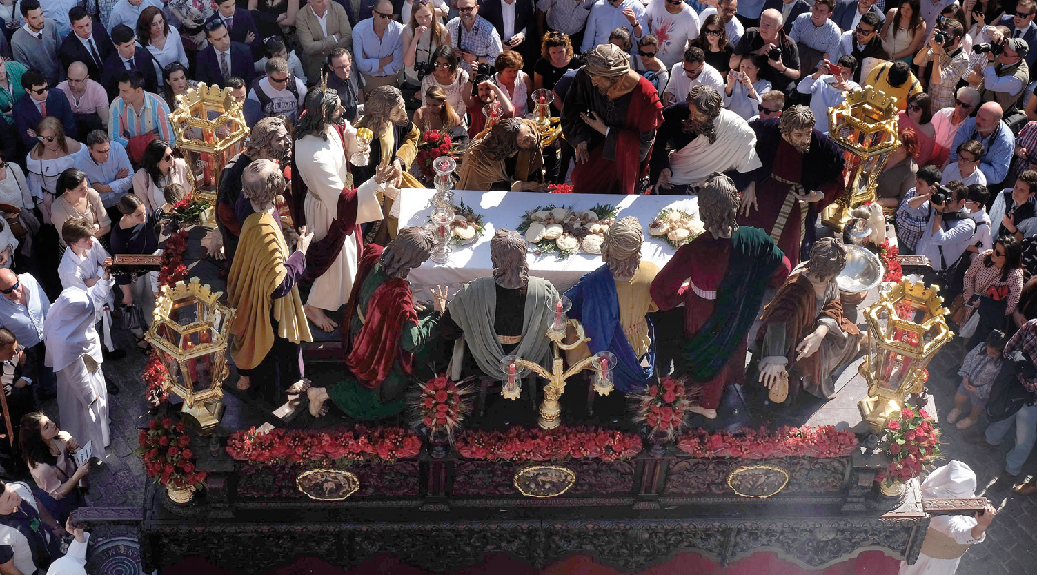 La cofradía cuenta con tres pasos. En el primero, Jesucristo instituye la Eucaristía acompañado en la mesa por los doce apóstoles. En el segundo aparece Cristo sedente, en actitud de meditación, momentos antes de ser crucificado. El tercero muestra a la Dolorosa bajo palio.