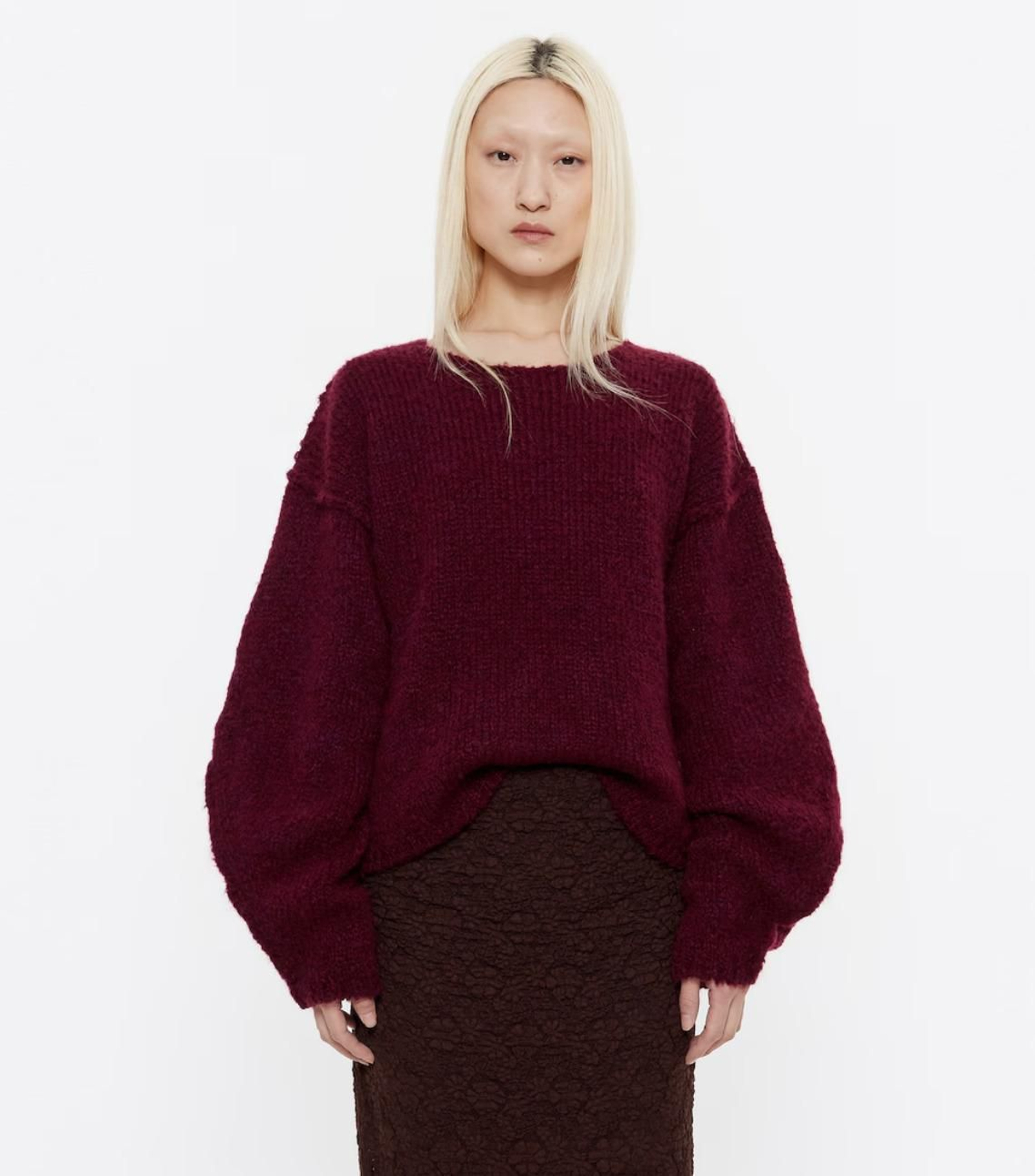 Jersey mezcla de alpaca en color burdeos. El modelo es de corte recto, escote barco redondeado, manga maxi-larga con volumen y costuras al revés.
