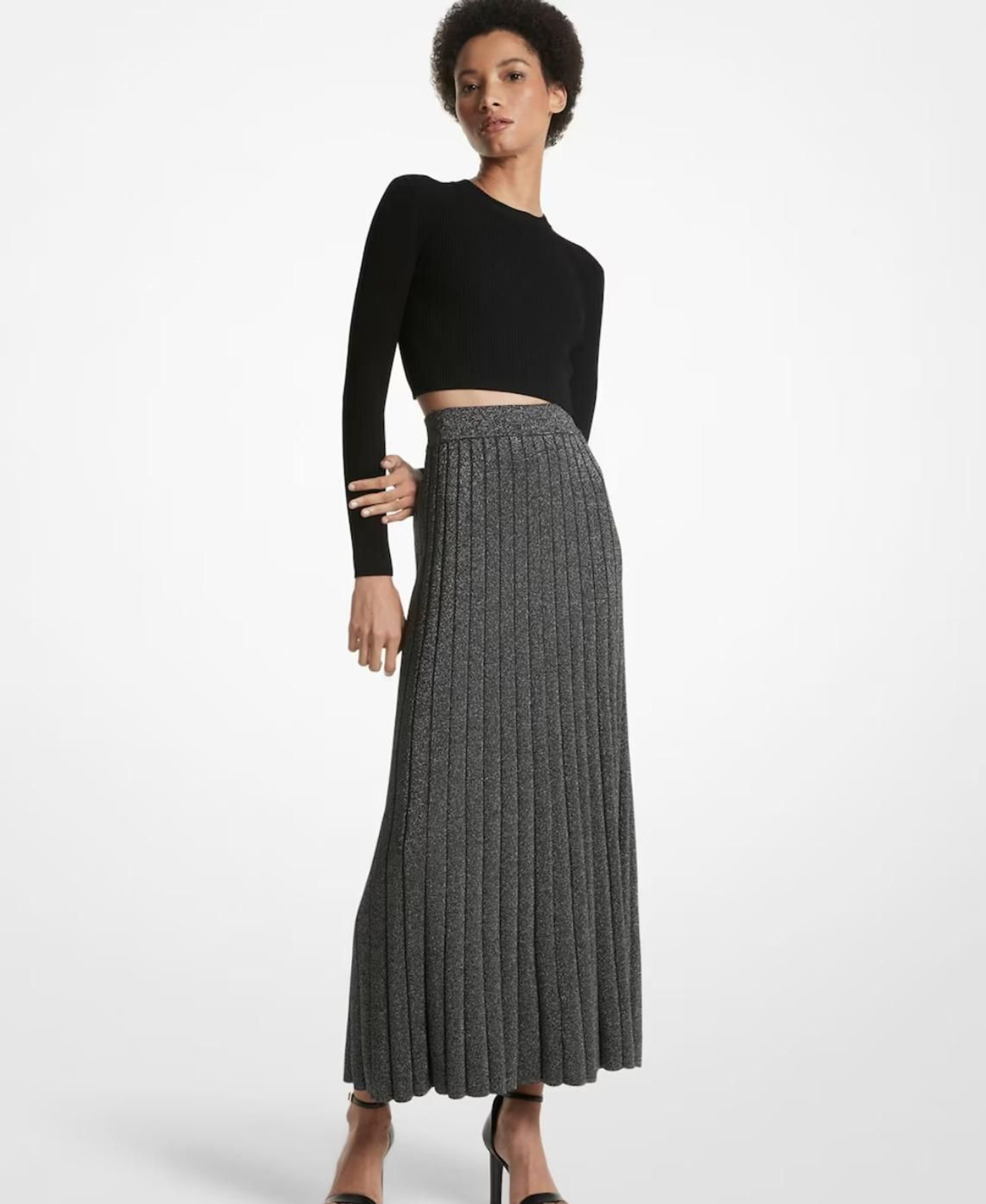 Deslumbra a cada paso con esta brillante falda plisada. La confección con hilos metalizados hace que resplandezca de forma exquisita en cada movimiento.