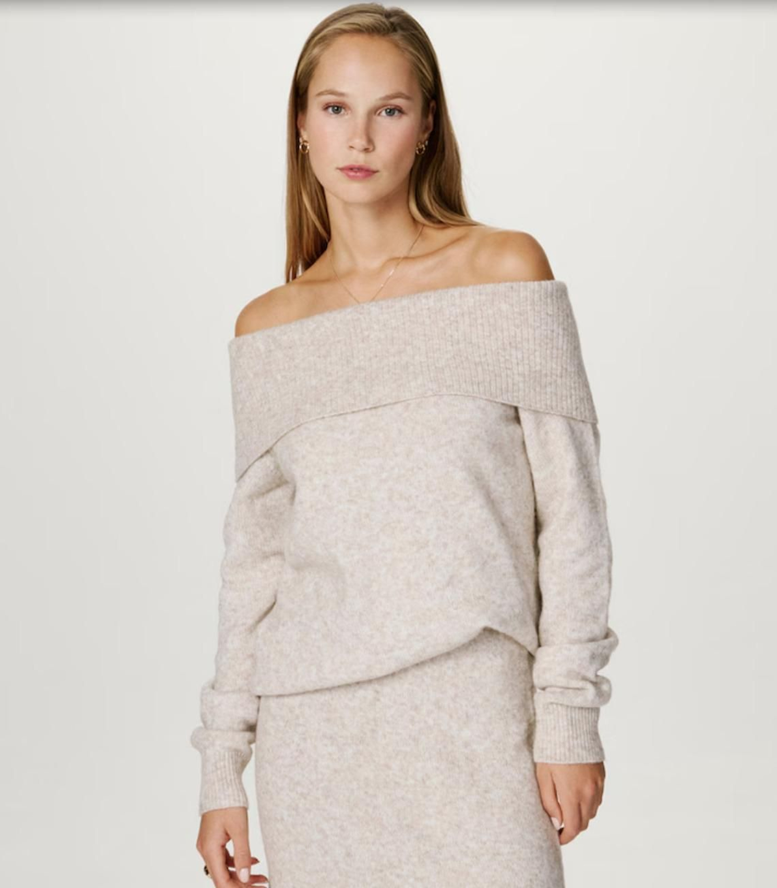 Jersey amplio sin hombros con puños acanalados en tono beige. El escote bardot añade femineidad y delicadeza a cualquier look.