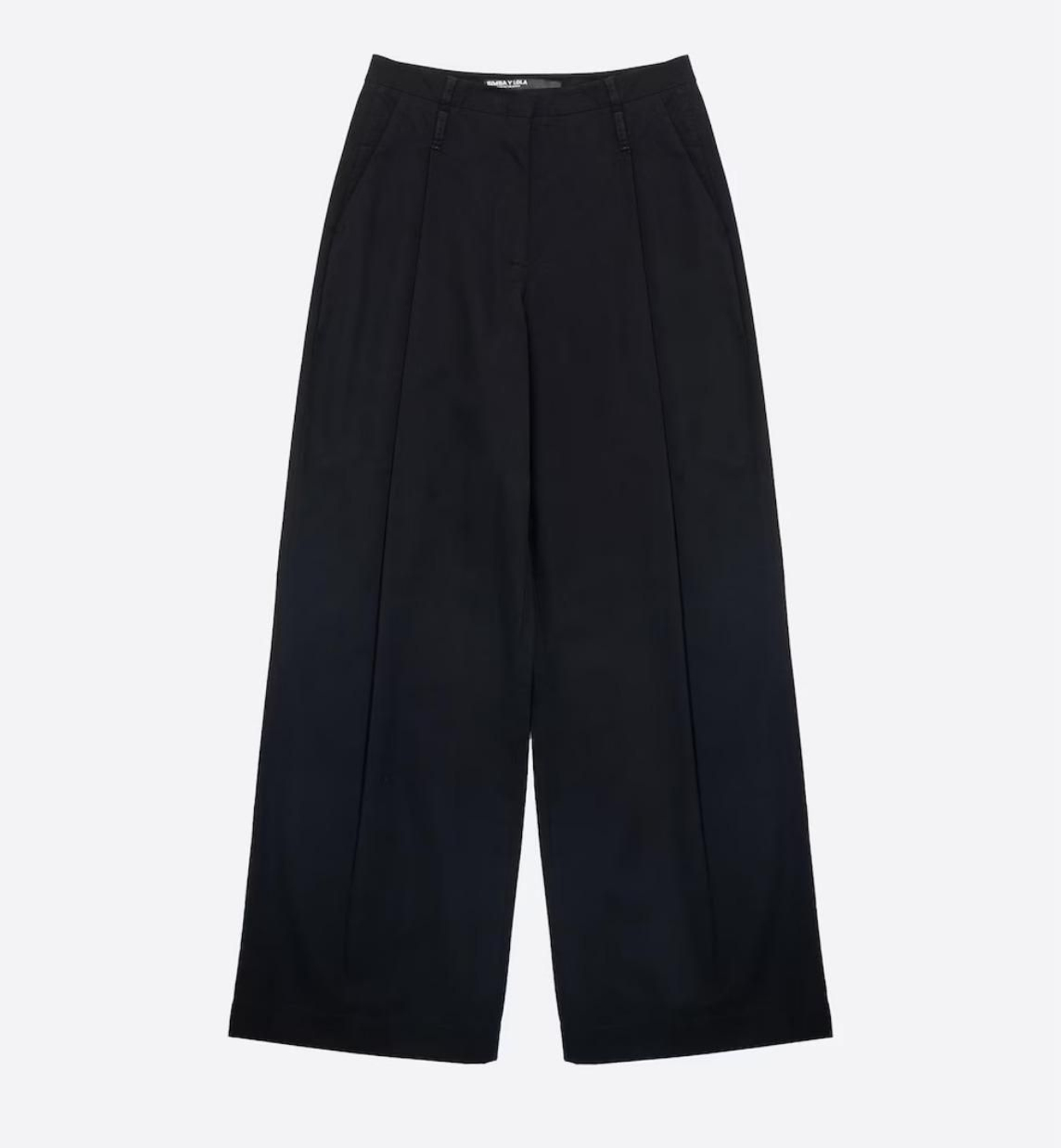 Pantalón de algodón en color negro con cintura estrecha de tiro medio y bolsillos laterales.