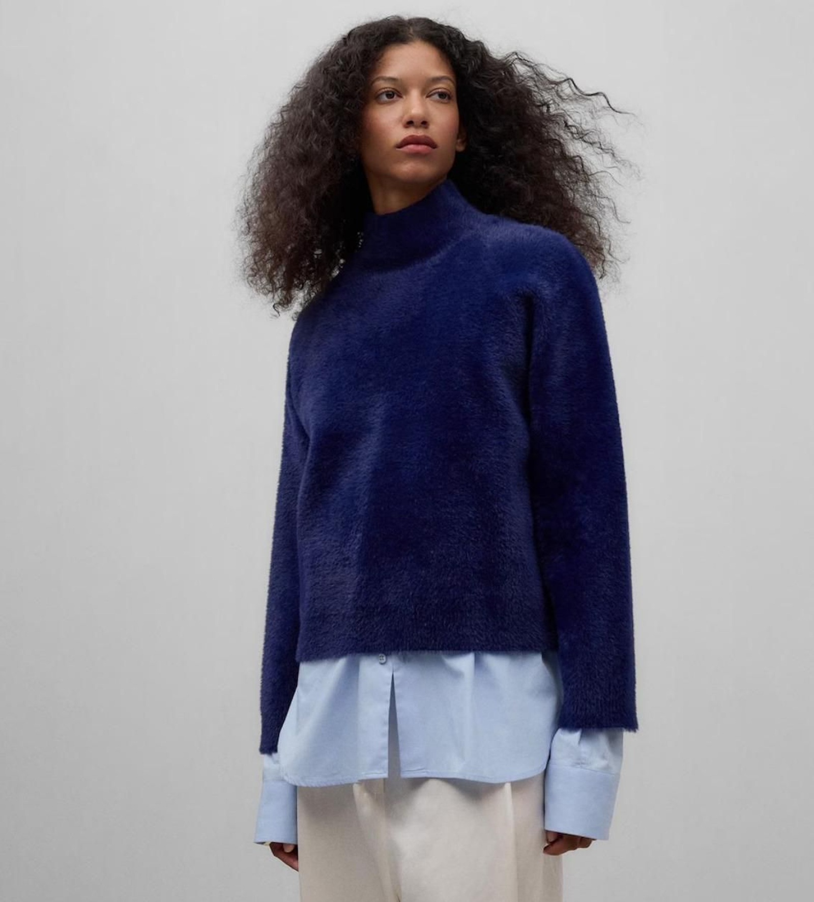 El jersey azul marino de punto con efecto pelo y manga raglán se convertirán en todo un fondo de armario en invierno que no pasa de moda.