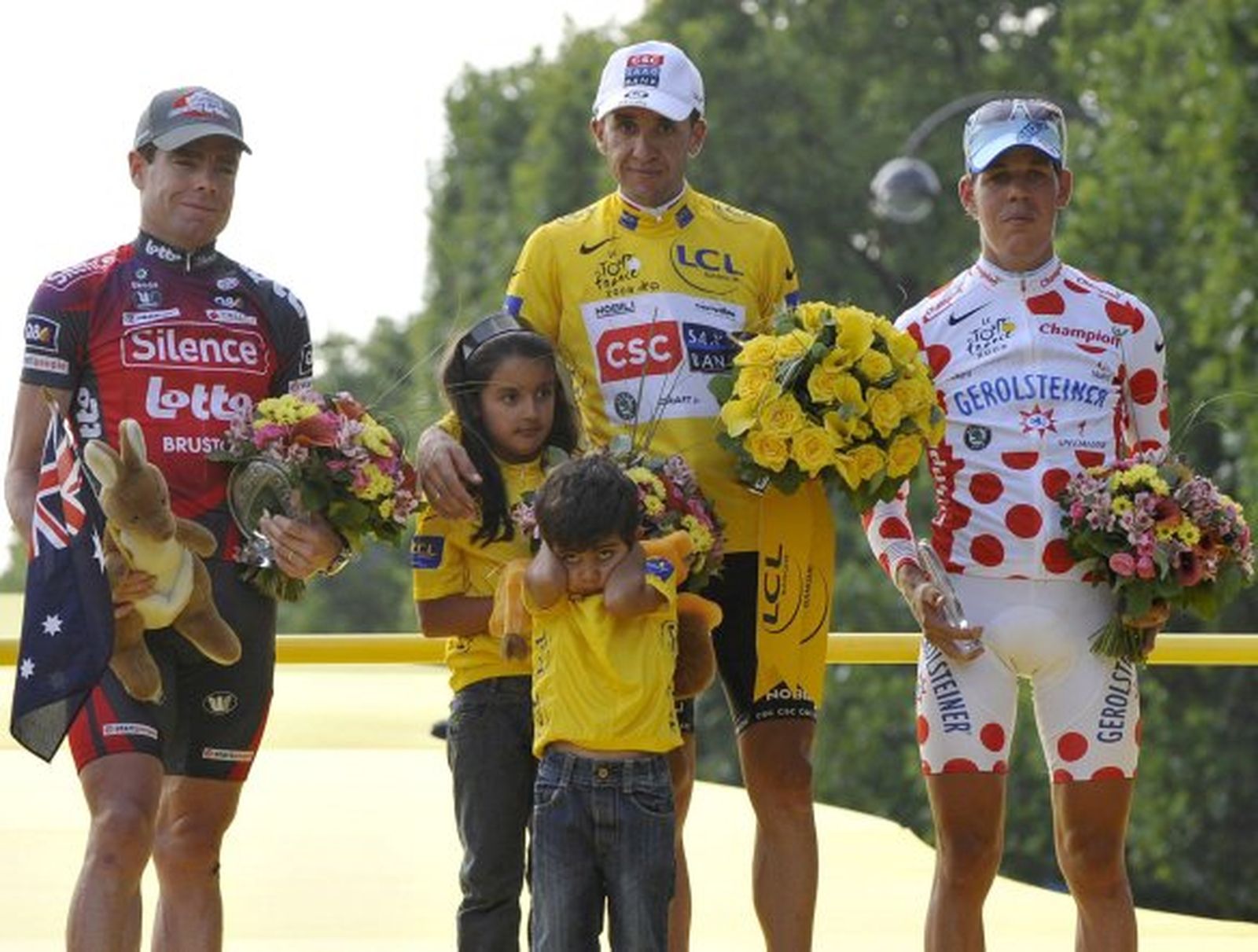 Sonriente, acompañado de sus dos hijos, Claudia, de seis años, y Yeray, de cuatro, Sastre posa para una foto histórica, con el Arco del Triunfo de fondo y el himno español, raudo como un ciclista en fuga, como música de fondo. A su diestra, el australiano Cadel Evans tiene el rostro largo, serio, de pocos amigos. Hace carantoñas a los hijos de sastre pero no está cómodo en ese podium que conoce tan bien. Fue segundo el año pasado. A la izquierda está Bernhard Kohl, que saborea vestido con el maillot de puntos rojos, el de la montaña, el tercer escalón del podium como un premio gordo, el más grande de ningún austríaco en el Tour.