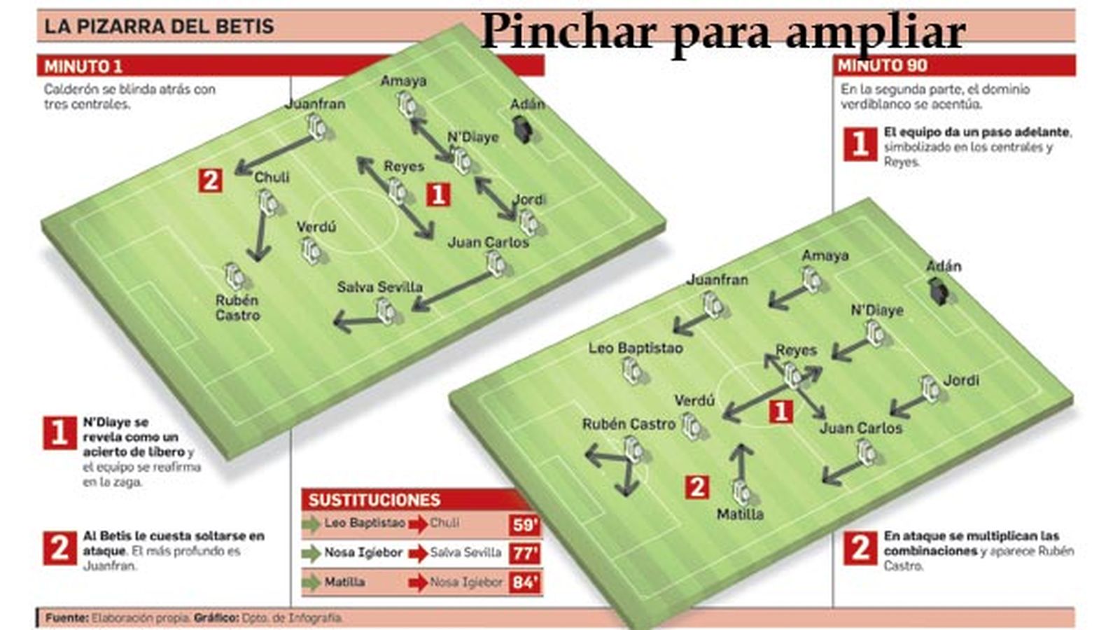 El paso adelante ordenado por Calderón y propiciado por un Reyes ambicioso provocó que apareciese la pegada de Rubén Castro. El equipo merodeó cada vez más el área de Casilla hasta que el canario aprovechó un trallazo al palo del chileno. Luego, en una contra, el delantero verdiblanco recortó a dos defensas antes de sacar un latigazo seco y raso imposible para el guardameta del Espanyol.