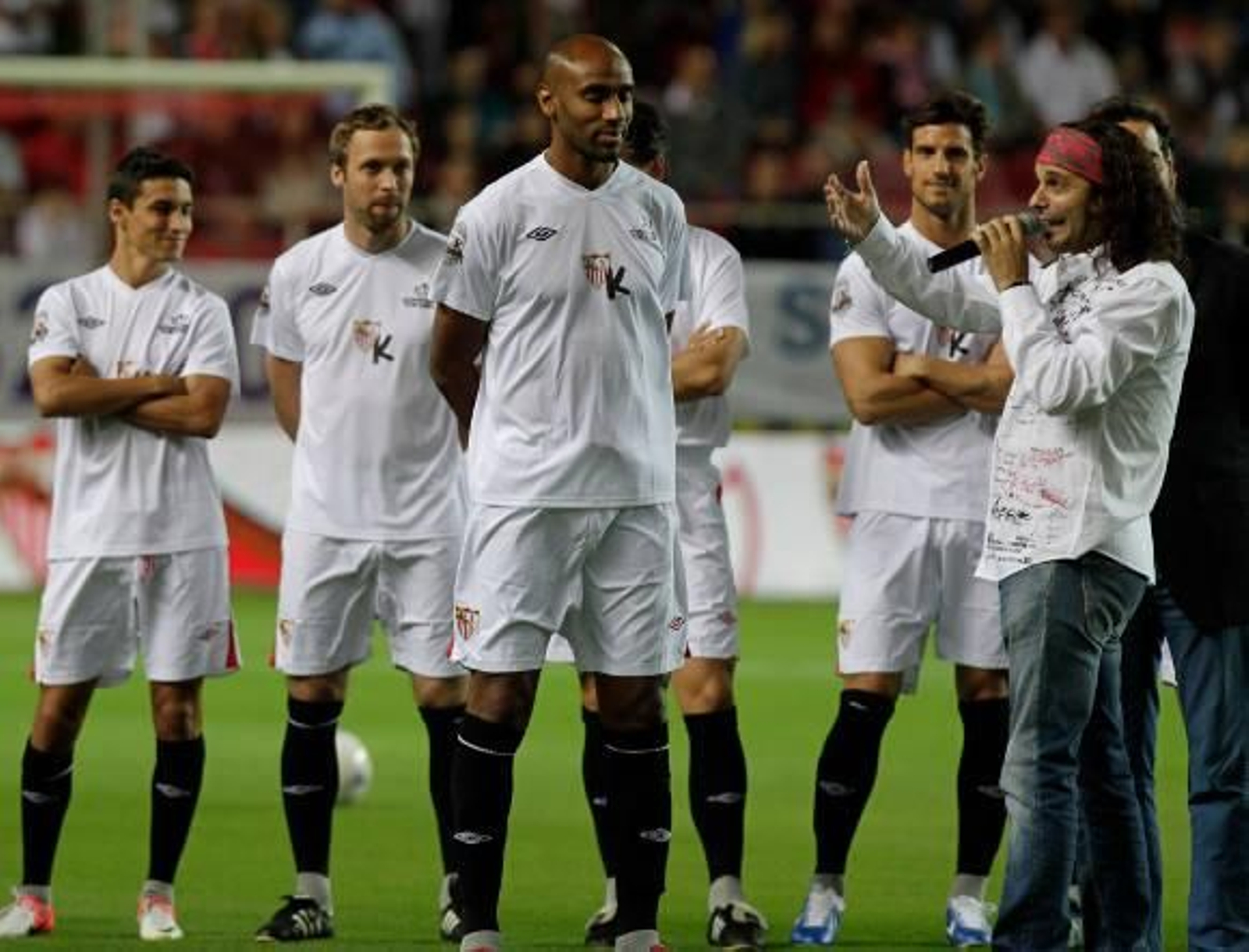 Fue un momento mágico, el reencuentro de Kanoute con los suyos. Pero aún quedaban muchos otros. Uno a uno, fueron saltando al campo los compañeros de la vieja guardia, los veteranos de una gloriosa y soñada guerra que se abrazaban al gigante como al capitán en el que se depositan todos los miedos e inseguridades. El menudo David, uno de los capitanes que vivió el ascenso desde los campos de Segunda División al Olimpo de los títulos continentales y nacionales, fue el primero en rendirle su particular homenaje a Fredy. "¡Campeones, campeones, oé, oé, oé!", sonaba en un nostálgico coliseo. Y luego fueron saliendo Javi Navarro, el capitán que levantó los cinco títulos de aquel ciclo irrepetible; Diego Capel, quien con el dorsal 16 marcó el primer gol de aquella final que el Sevilla, el sevillismo y el propio Kanoute le debían a Antonio Puerta; Martí, otro de los integrantes del puesto de mando de la vieja guardia; como Dragutinovic, como Aitor Ocio, como el líder Pablo Alfaro. Hinkel, Jesús Navas, Palop, el actual capitán..., todos se fueron abrazando a Kanoute, mientras el estadio se unía en aplausos que eran abrazos.