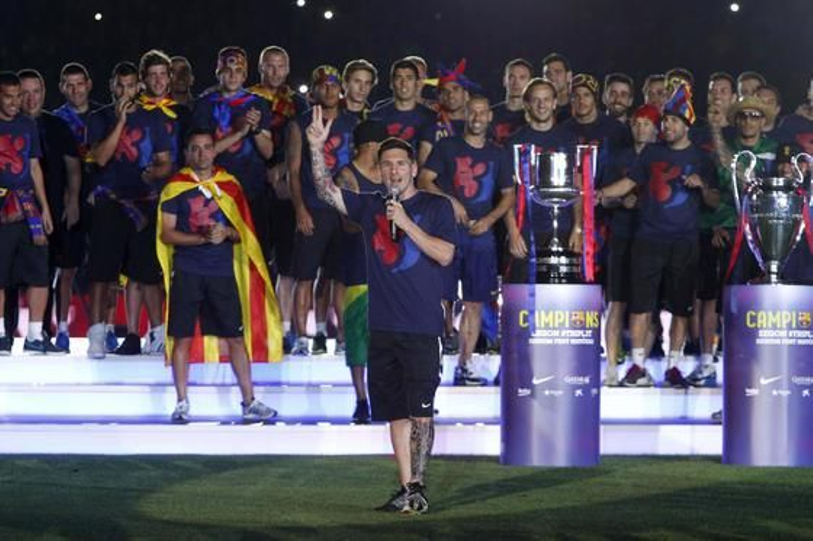 Enfundados en una camiseta conmemorativa, en la que el escudo del Barça tenía impreso un 3 para rememorar el triplete y con el lema Orgull de campions (Orgullo de campeones), los jugadores no han decaído en su ánimo durante todo el recorrido, a pesar de que muchos no durmieron la pasada noche, tras la fiesta en Berlín tras la consecución de la Copa de Europa. Después del desfile, la fiesta se trasladó al Camp Nou ante 70.000 aficionados.