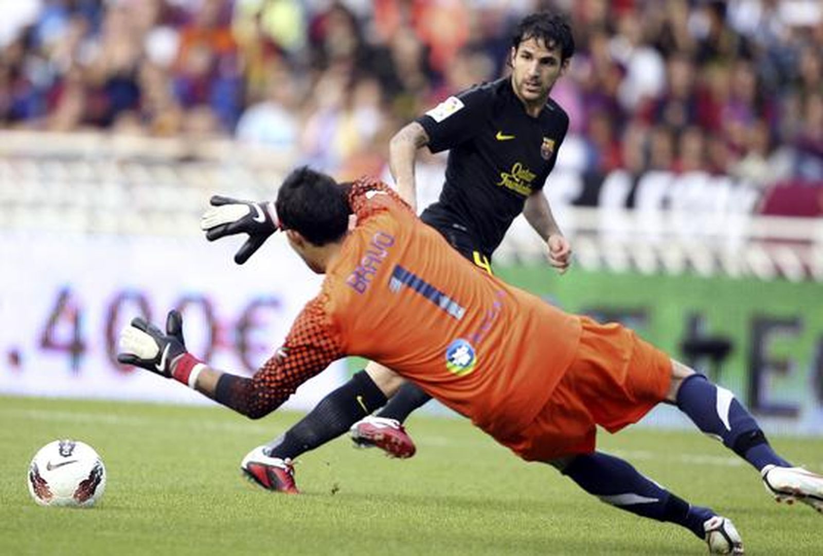 El conjunto blaugrana, sin embargo, lo hace de memoria independientemente del jugador que esté en el césped y así en el minuto 10, en la típica jugada de tiralíneas a la que todo aficionado se ha acostumbrado ya, Alexis asistió a Xabi que marcó a placer. El público de Anoeta estaba molesto con Mateu Lahoz por entender que el gol del jugador catalán se produjo en fuera de juego y en medio de la protesta llegó el segundo, de ejecución similar y con culminación de un Cesc que sigue en racha desde su llegada del Arsenal.