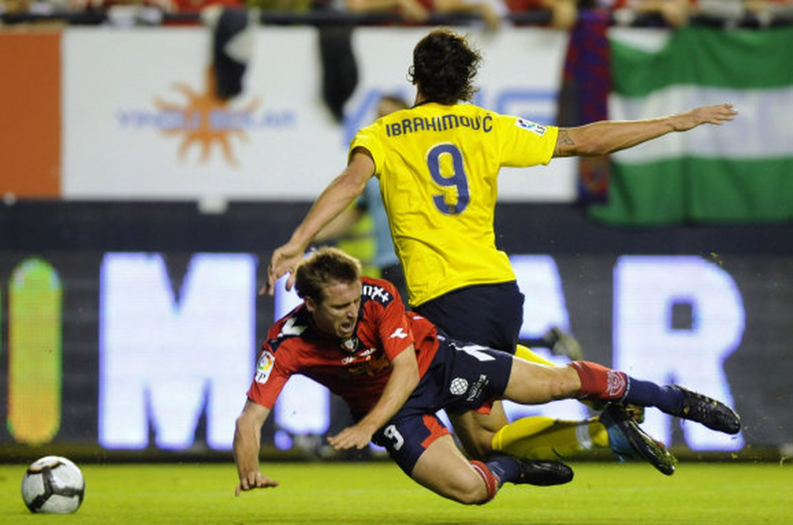 En el minuto 68, el árbitro le perdonó a Osasuna le expulsión de Miguel Flaño al cortar un avance en solitario de Ibrahimovic, pero ni siquiera pitó falta del jugador 'rojillo'.