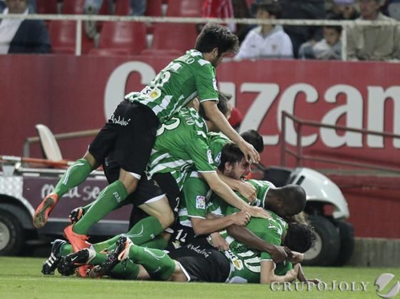 Mas no había acabado ahí el festival de Beñat. Cuando el tiempo ya estaba prácticamente cumplido fue Fernando Navarro quien hizo falta esta vez sobre Jonathan Pereira. Igual de justa que la primera de Medel, Beñat tuvo tiempo para pensar, para calibrar las distancias, y apostó por la sutileza. "Estoy en el borde del área, me temen y van a saltar de manera colectiva", debió pensar el vasco. Solución, disparo sutil, colocado, raso, por debajo de esa nube de jugadores que se empeñan en defender donde no va la pelota, y el balón vuelve a tocar en el poste y entra de nuevo. Un verdadero golazo para darle lustre a ese cambio en el trono del fútbol según Sevilla. La fiesta era verdiblanca, y con toda la razón del mundo para ello.