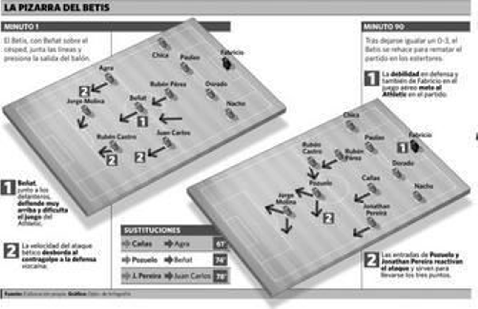 Como ya ocurriera la temporada pasada, en otra exhibición del equipo de Mel, el cuadro verdiblanco comenzó con una presión muy adelantada que asfixió al Athletic hasta el ridículo, provocando que incluso Marcelo Bielsa moviera sus piezas cuando apenas se llevaban 24 minutos. Esa presión a la que ayudó todo el equipo con una defensa adelantada y bien plantada aguantó hasta que el centro del campo, sobre todo Beñat y Rubén Pérez, tuvo oxígeno. Aunque también las carencias en el juego aéreo, un aspecto en el que Mel había incidido durante la semana, acabaron por meter a su rival en un partido del que parecía expulsado.