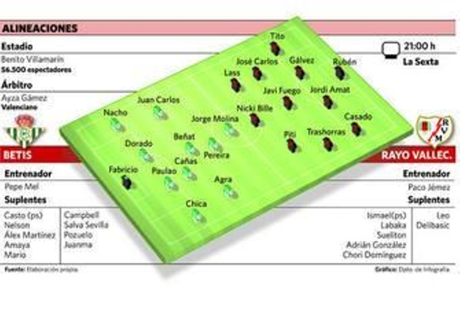 Todo dentro del sistema que más le gusta a Mel, el 4-4-2, aunque según cómo vaya transcurriendo el encuentro podría haber algunas variantes. Tampoco se debe pasar por alto la ausencia de Rubén Castro, aunque el Betis ya demostró la temporada pasada que es capaz de ganar sin el delantero canario, y en este sentido cabe mencionar el buen comienzo de Jorge Molina. Quizá la última temporada estuvo a la sombra de Roque Santa Cruz y eso le mermó la confianza, pero es un delantero que puede aportar mucho más y con un poco de fortuna convertirse en un jugador importante dentro del equipo.