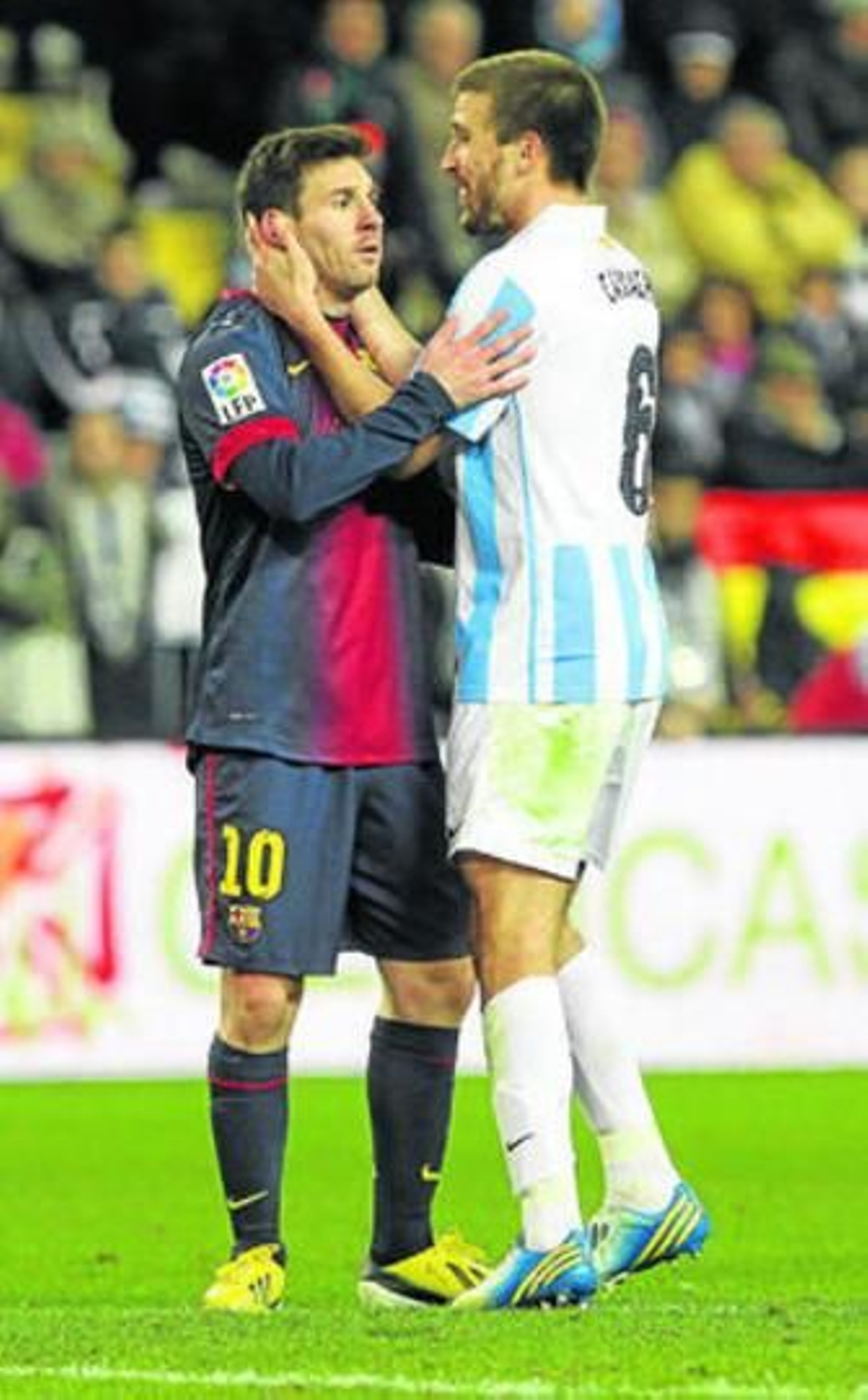 El malaguista Camacho abraza a Messi en un partido ante el Barcelona.