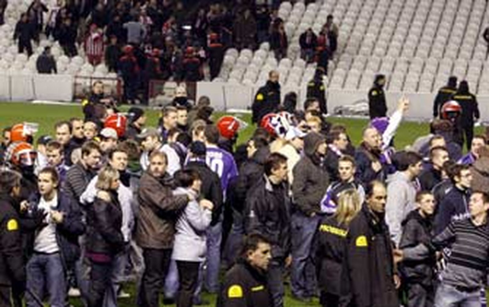 Primero los guardas de seguridad y después los ertzainas tuvieron que actuar sobre la misma hierba para sofocar los enfrentamientos. Luego, los seguidores del equipo belga permanecieron retenidos en la grada hasta que se disipara el grupo de aficionados rojiblancos que aguardaba en las afueras del estadio para reiniciar los disturbios.