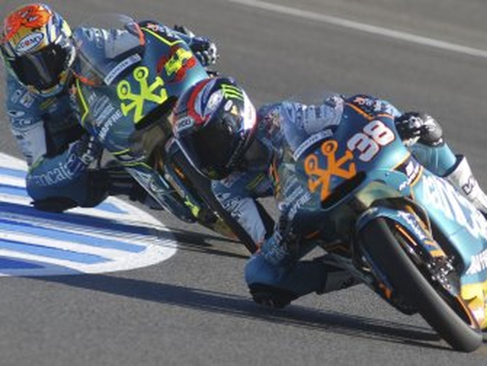 Esta circunstancia, con Smith dominando claramente la prueba, abrió una auténtica batalla por el segundo y tercer puesto. Al grupo formado por Marc Márquez, Cortese y Reading se le unió Espargaró y Gadea, un hecho que hizo aumentar el nivel de emoción entre los aficionados. Las pasadas y la lucha fueron una constante a partir de entonces, algo que sirvió a Efren Vázquez (que ayer hizo la mejor clasificación de su vida) y el alemán Folger, que había salido sorprendentemente desde la última posición en parrilla, para conectar con el grupo.