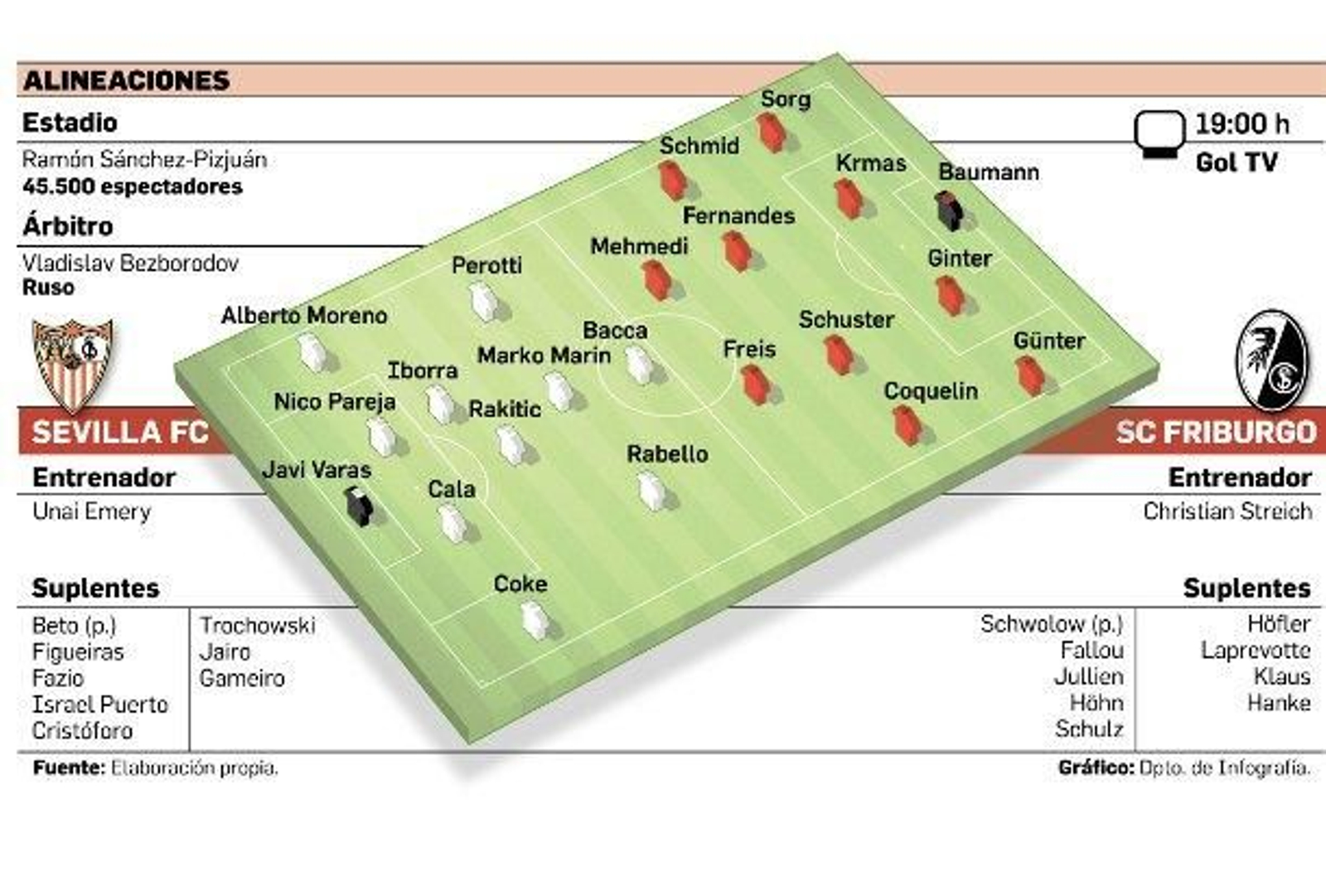 Precisamente Javi Varas retornará a la titularidad ante el Friburgo. Por delante, Coke, que no jugó un minuto ante la Real, debe retornar en detrimento de Diogo Figueiras. Es de suponer que seguirá como central en el perfil diestro Cala, que se verá obligado a descansar luego ante el Almería por su expulsión en San Sebastián. Para el domingo, es posible que Unai tire ya de Fazio en lugar del lebrijano. Pareja y Alberto Moreno completarán la línea de zagueros.
