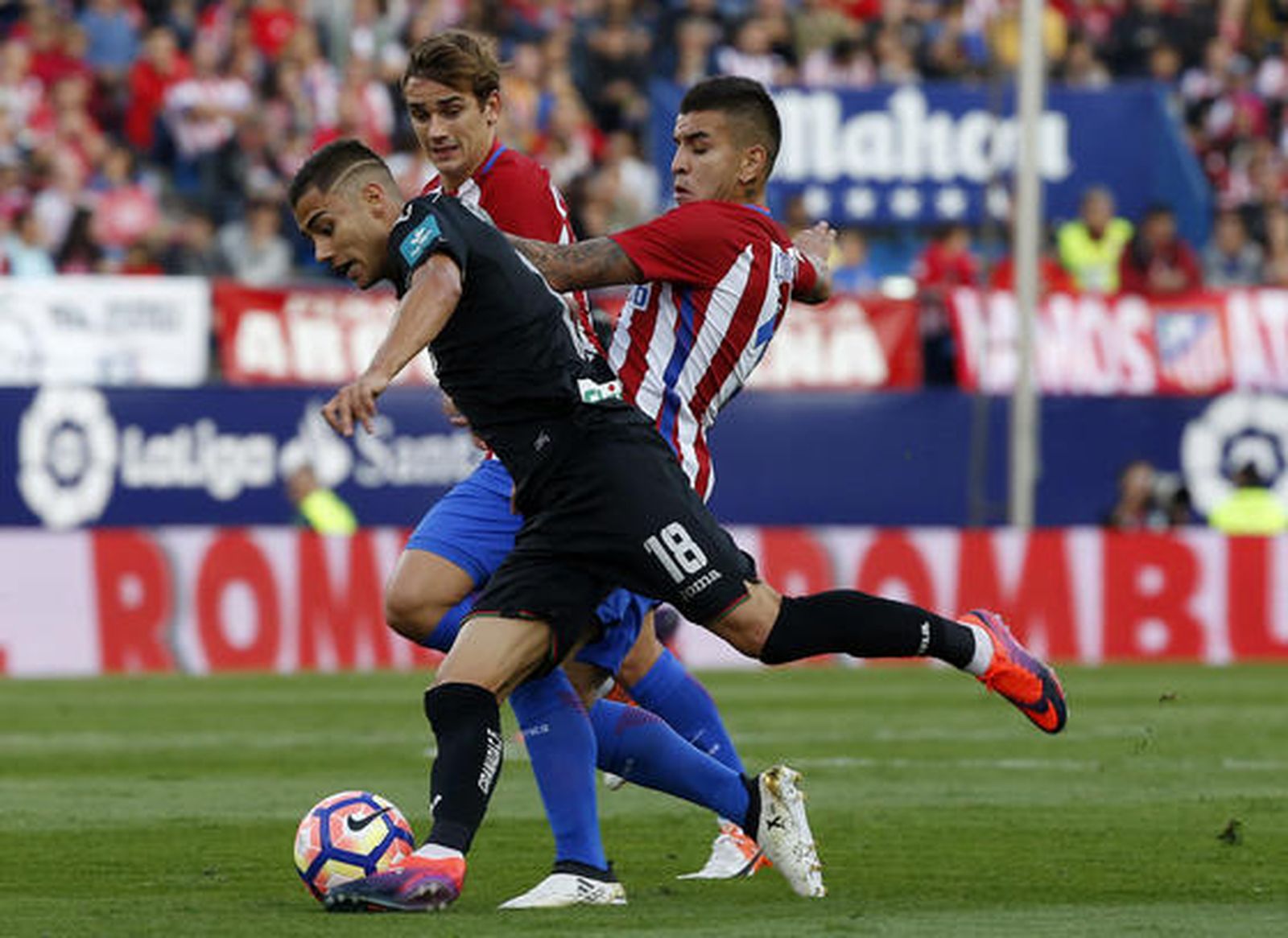 Hasta entonces, el Atlético chocó contra la acumulación de futbolistas del Granada; desde entonces, la remontada sólo fue una cuestión de tiempo. Porque el conjunto madrileño respondió con voracidad. Fue veloz, ágil, profundo, desbordante y efectivo en la ofensiva por el empate, primero, y por la victoria, minutos después. Lo uno y lo otro llevaron la firma del belga Yannick Carrasco. En el minuto 33, la igualada, remachada por el extremo, oportuno para transformar en el 1-1 un balón suelto en el área entre un cabezazo del francés Antoine Griezmann y un rechace flojo, al medio, casi un regalo, del mexicano Guillermo Ochoa. Una concesión decisiva, entre alguna protesta por una supuesta falta previa en un salto anterior.
