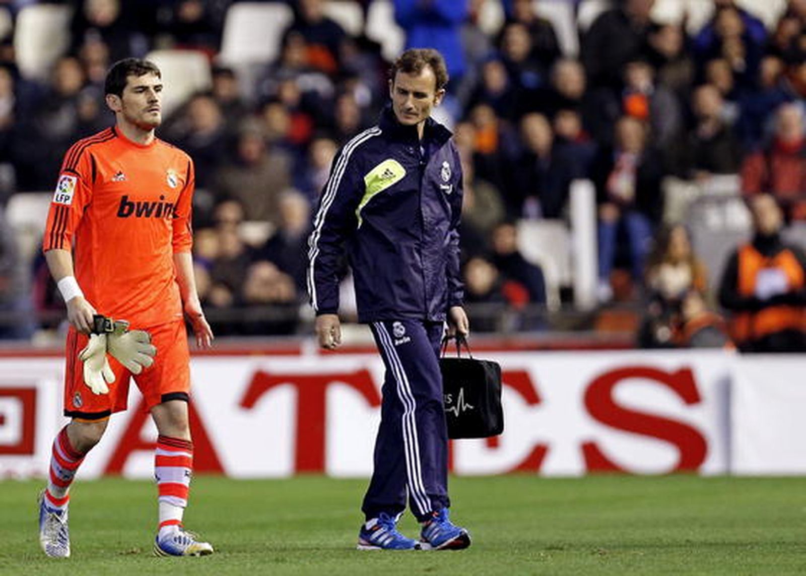 Iker Casillas, portero del Real Madrid, estará alejado de los terrenos de juego por una fractura en la base del primer metacarpiano de la mano izquierda durante un periodo aproximado de entre seis y ocho semanas, según confirmaron fuentes próximas al jugador. El guardameta madridista tuvo que abandonar el partido de vuelta de los cuartos de final de la Copa del Rey (1-1) que jugaba su equipo ante el Valencia, después de recibir en el minuto 17 de forma fortuita una patada de su compañero Álvaro Arbeloa.