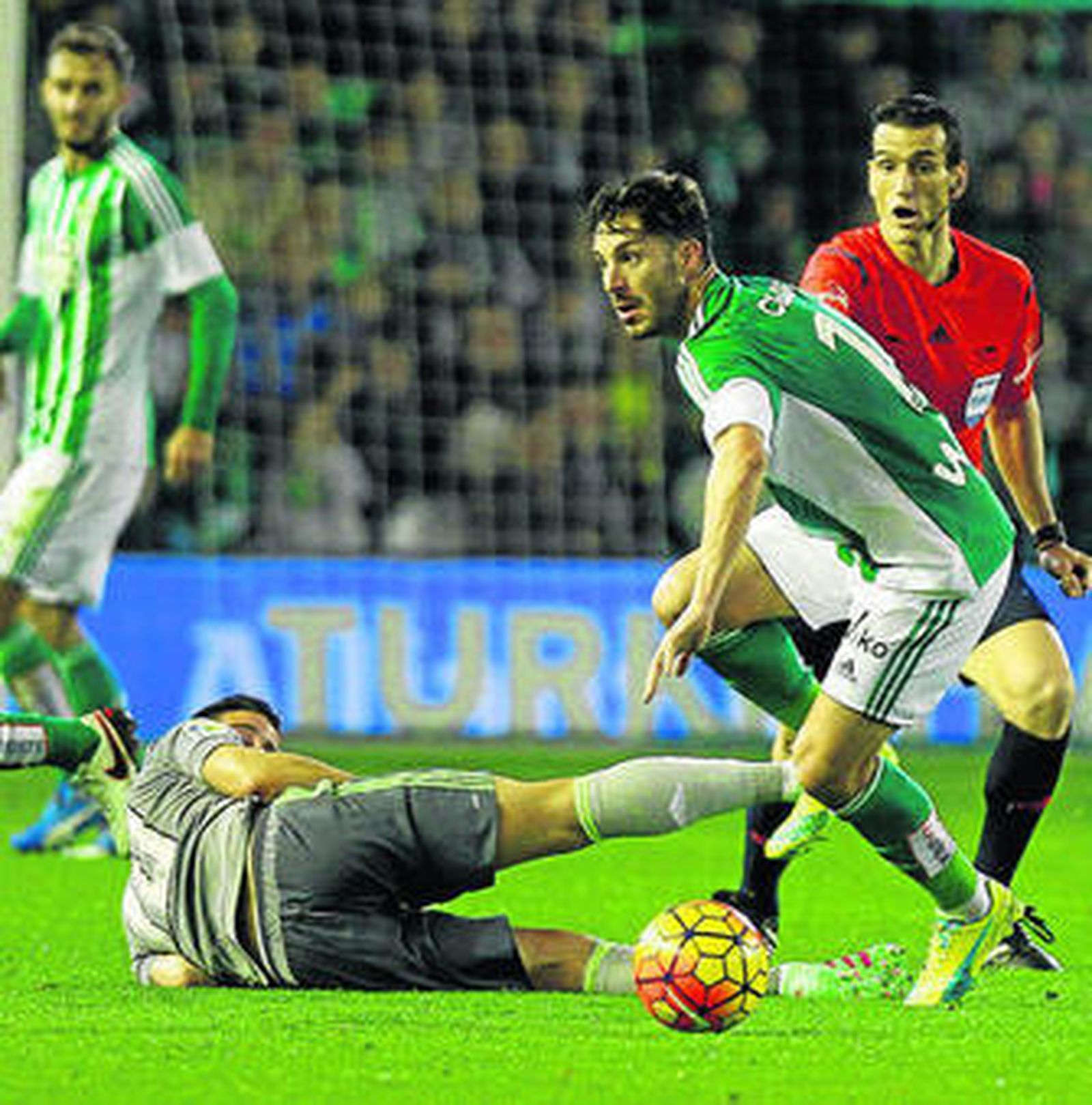 El pitido del final del partido sirvió para aliviar la tensión acumulada en la cuadrilla bética, que en manada, se fue al centro del campo a agradecer a la afición el apoyo durante el envite ante el Real Madrid. Un choque que se puso de cara gracias al golazo de Cejudo.