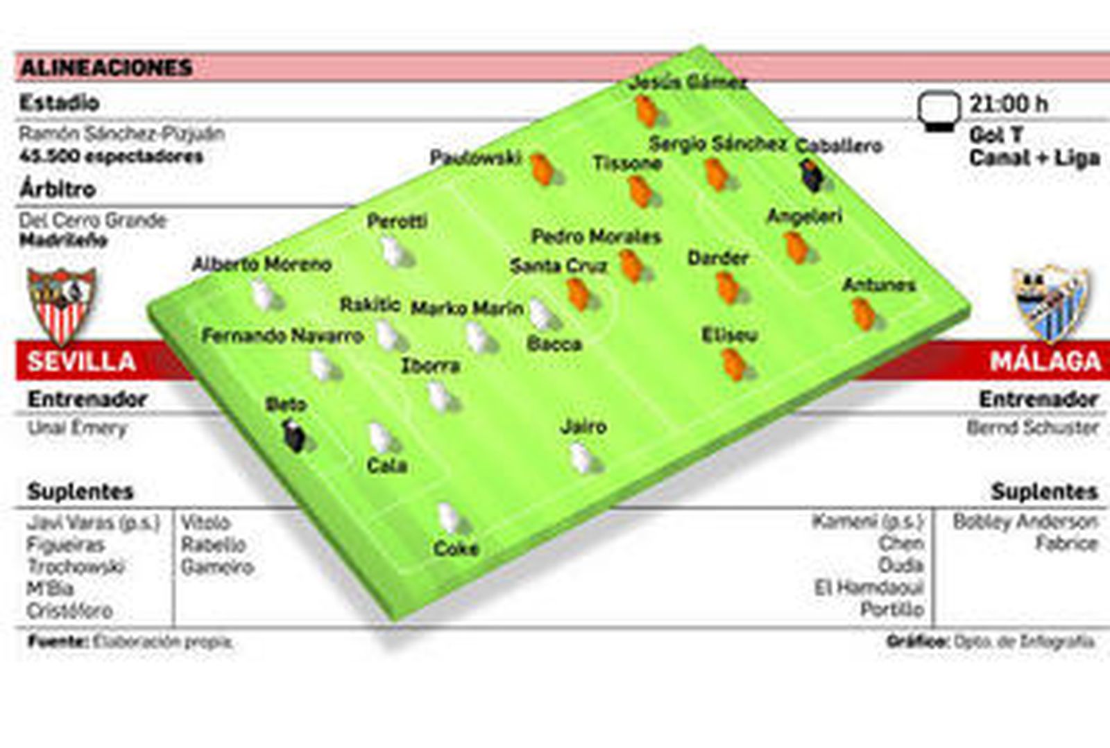 El Sevilla, sí, el Sevilla, pero con qué actores en su reparto. Con la buena nueva de ver a Trochowski en la lista, cabe suponer que Emery refresque al equipo tras una semana cargada. Además, también puede existir cierto pique por la polémica originada cuando al Málaga lo dejaron fuera de Europa y entró en su lugar el Sevilla. Es otro componente adicional, aunque lo importante será comprobar si Marko Marin es capaz de brillar también en la Liga, si Iborra equilibra al equipo, si M'Bia está para debutar y para ayudar... Todos esos elementos son muy necesarios para que el Sevilla comience a sumar y evite así un horizonte preocupante cuando menos.